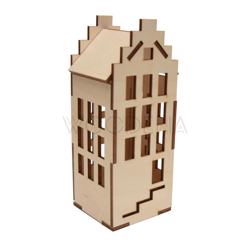 Drewniany lamion domek kamieniczka z okienkami