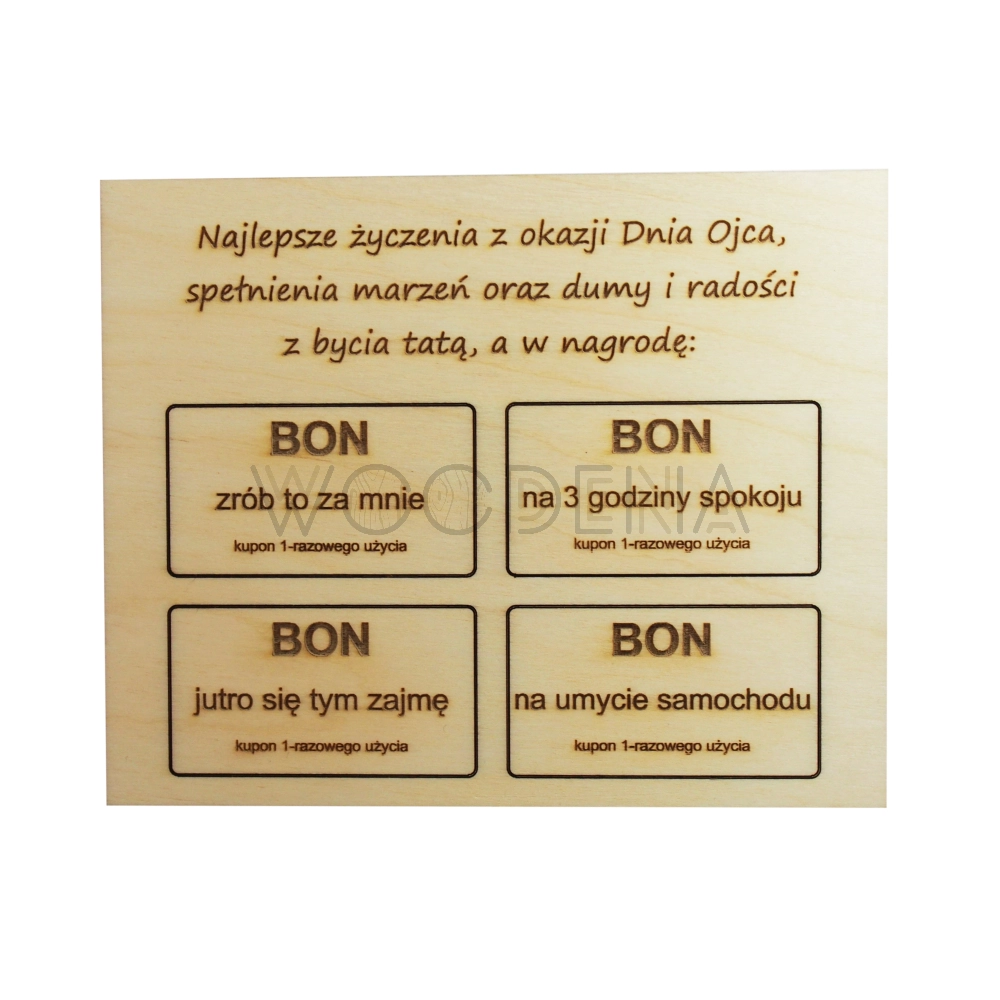 Drewniany bon dla taty na Dzień Ojca posiada życzenia oraz oryginalne bony na:
