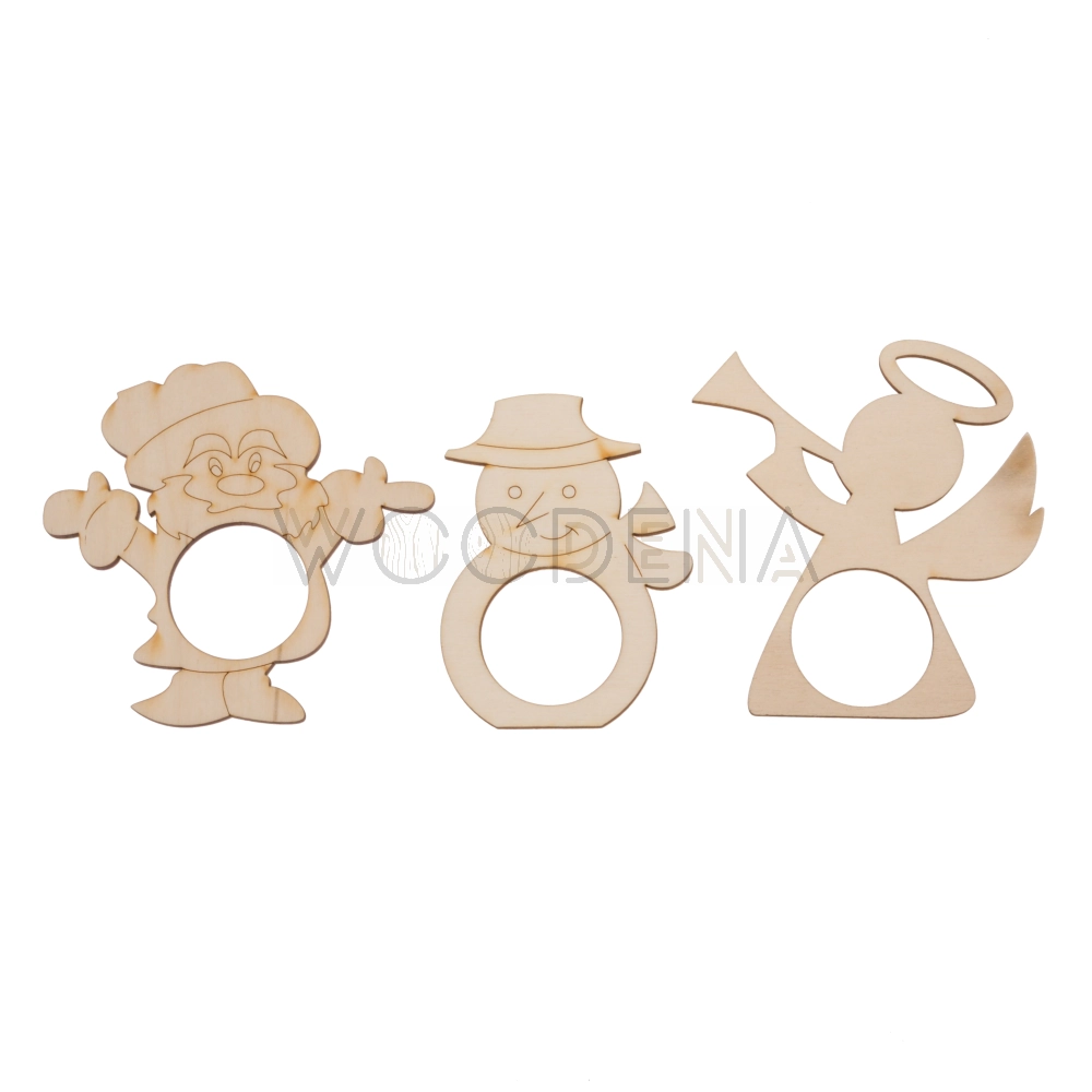 The set of wooden napkin rings consists of three napkin holders in the form of Santa Claus, snowman, and angel. Such a set can be used as an ornament for a flower arrangement or a Christmas tree. The wooden Christmas set is made of high-quality birch plywood, which is resistant to damage. Laser processing allows for a smooth surface, which means that the decoration can be painted in any color and embellished with techniques: