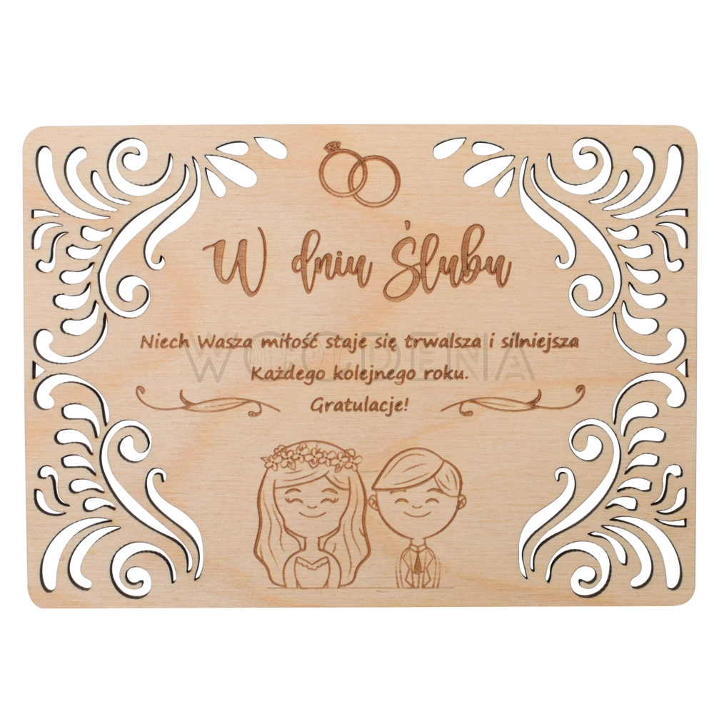 Drewniana kartka ślubna z grawerem doskonale sprawdzi się jako prezent dla nowożeńców. Możesz na niej wyrazić swoje najlepsze życzenia w elegancki i oryginalny sposób. Ta ozdobna kartka będzie przypominać młodej parze o tym wyjątkowym dniu przez wiele lat.