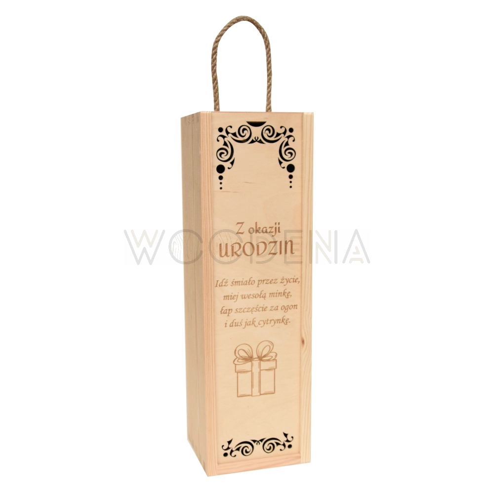 Drewniana skrzynka na wino na urodziny - ozdobna z grawerem, urodzinowe pudełko z drewna na alkohol; skrzynka z zasuwką, na jedno wino.