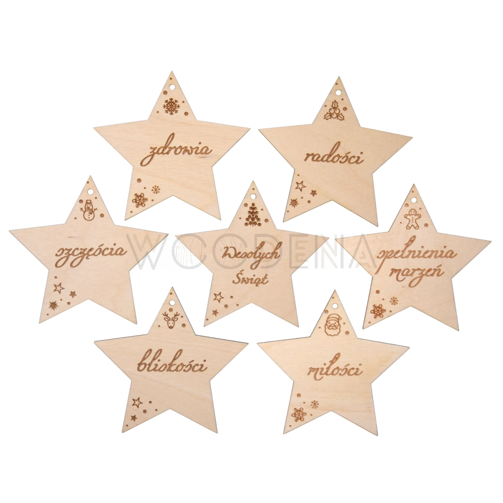 Dekoracyjne drewniane gwiazdki z grawerowanymi życzeniami - zestaw 7 szt.