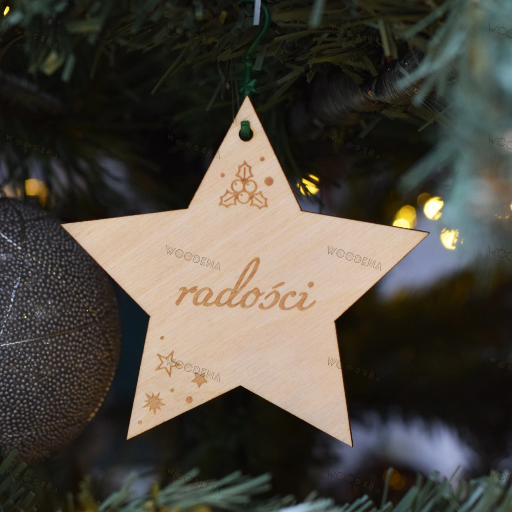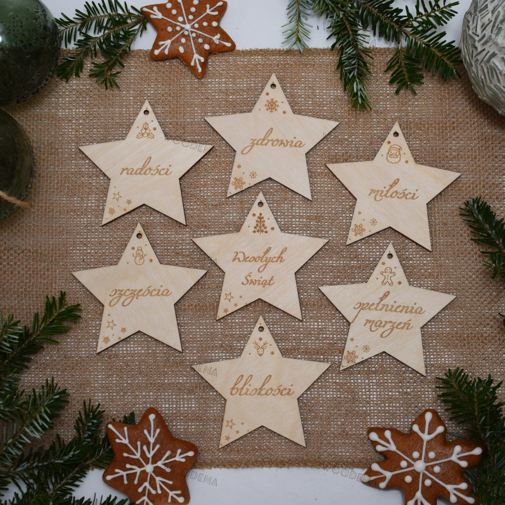 Wyszukujesz oryginalnych ozdób na święta Bożego Narodzenia? Ten zestaw drewnianych gwiazdek z pewnością spełni Twoje oczekiwania! Wykonane ze sklejki drewnianej, te piękne dekoracje zachwycą swoim naturalnym wyglądem. Każda gwiazdka ma grawerowane życzenia, które dodadzą magii do Twojej choinki czy też świątecznego stroika.