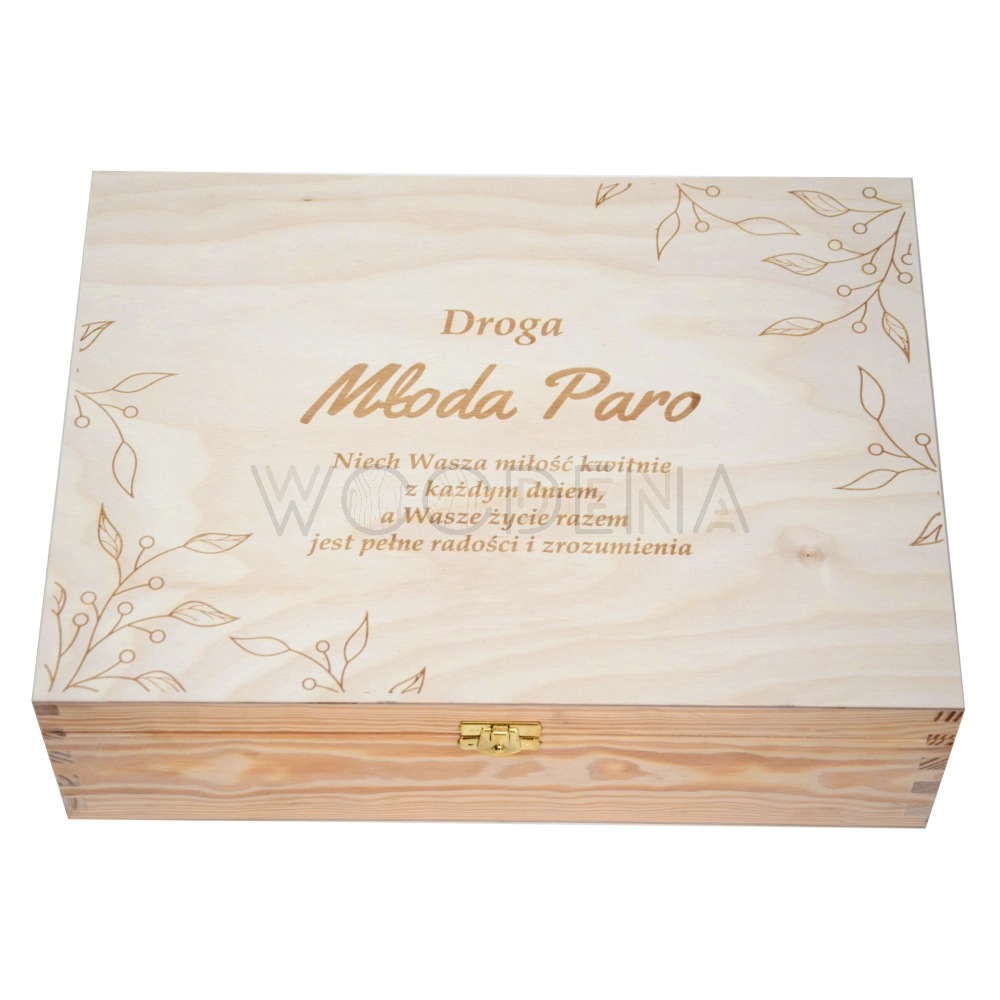 Drewniane pudełko na prezent ślubny z grawerem - życzenia dla Młodej Pary