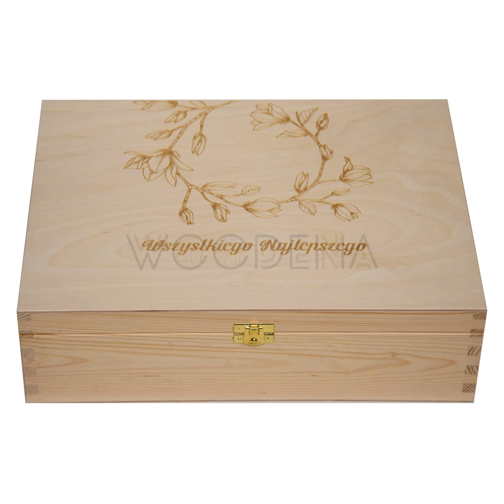 Eleganckie pudełko z drewna wykonane z wysokiej jakości materiałów, ozdobione pięknymi kwiatami i życzeniami. Produkt posiada grawer na wieku, który dodaje mu osobistego charakteru.