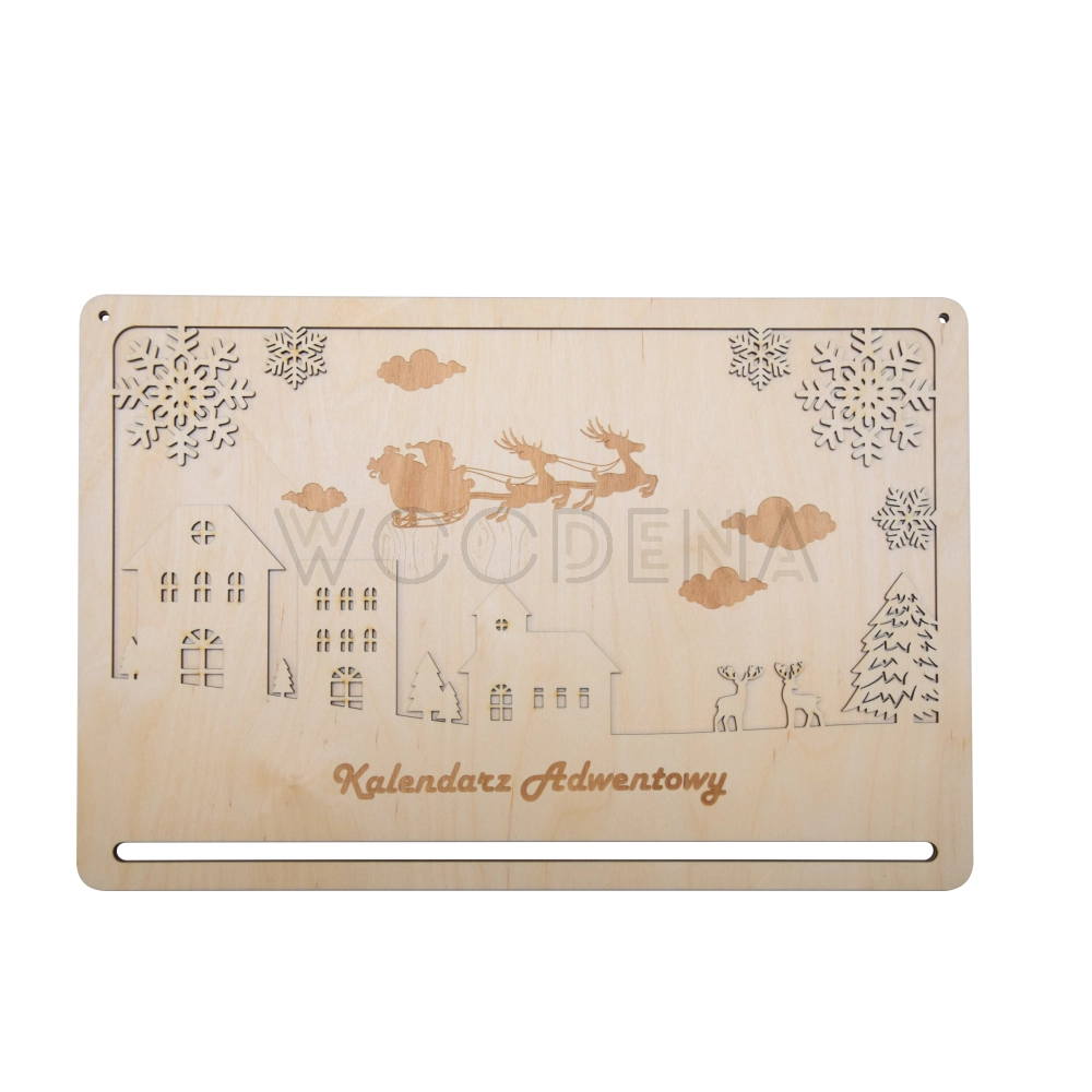 Kalendarz adwentowy składa się z dwóch sklejonych warstw ze sklejki drewnianej. Wierzchnia warstwa posiada wycięte piękne domki, choinki, śnieżynki i renifery, oraz wygrawerowany napis "Kalendarz Adwentowy". Spodnia warstwa ma wygrawerowanego uroczego Mikołaja z reniferami i chmurki.