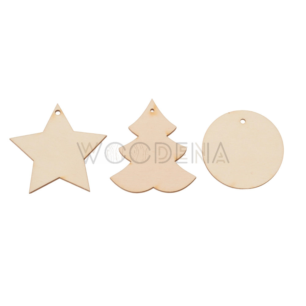 Zestaw drewnianych ozdób świątecznych to łącznie aż 15 sztuk drewnianych dekoracji na choinkę! W komplecie znajdują się elementy o kształcie gwiazdki, bombki i choinki. Drewniane ozdoby choinkowe świetnie komponują się na żywym drzewku. W dodatku jako producent ozdób ze sklejki, polecamy, aby powierzchnię poddać malowaniu, ozdabianiu lub wypalaniu, dzięki temu każdy z elementów nabierze unikalnego wyglądu.