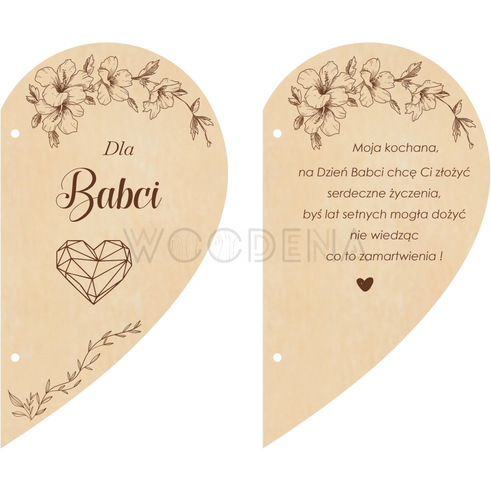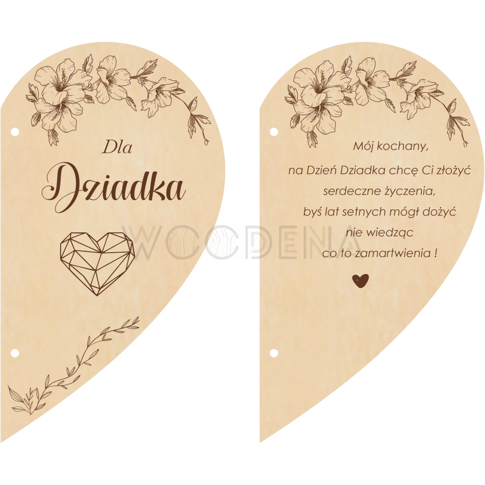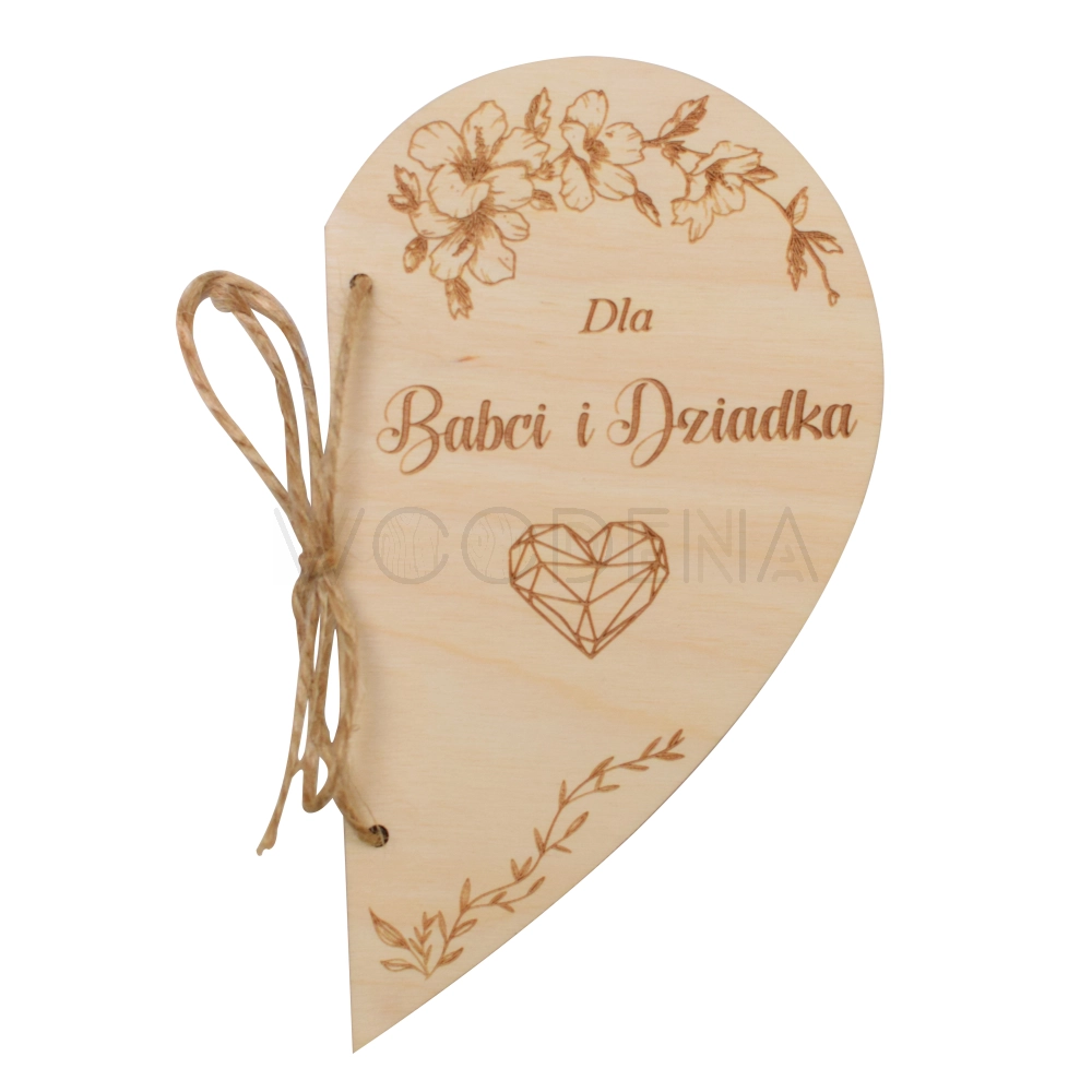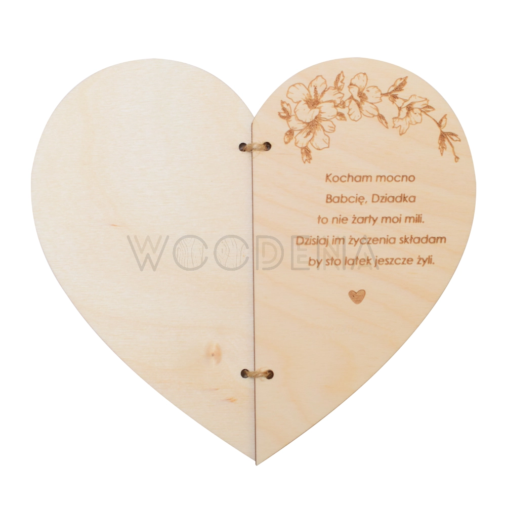 Kartka serce z życzeniami na Dzień Babci i Dziadka to kartka drewniana, wykonana ze sklejki brzozowej. Składa się z dwóch połówek serca połączonych ze sobą dekoracyjnym sznureczkiem. Produkt ten zawiera idealne na tę okazję życzenia oraz piękną, ozdobną grafikę kwiatów.