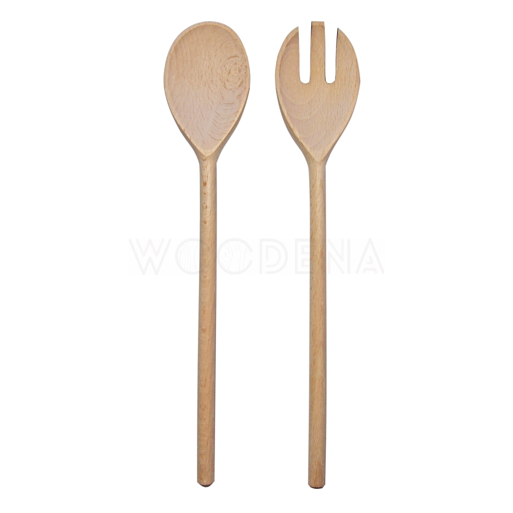 Komplet dwóch drewnianych łyżek, który świetnie sprawdzi się do nakładania i mieszania sałatki. Zestaw może posłużyć jako drewniane łyżki do mieszania zupy oraz innych dań w naczyniach pokrytych teflonem. Zostały wykonane z naturalnego i surowego materiału, dlatego mogą mieć kontakt z żywnością.