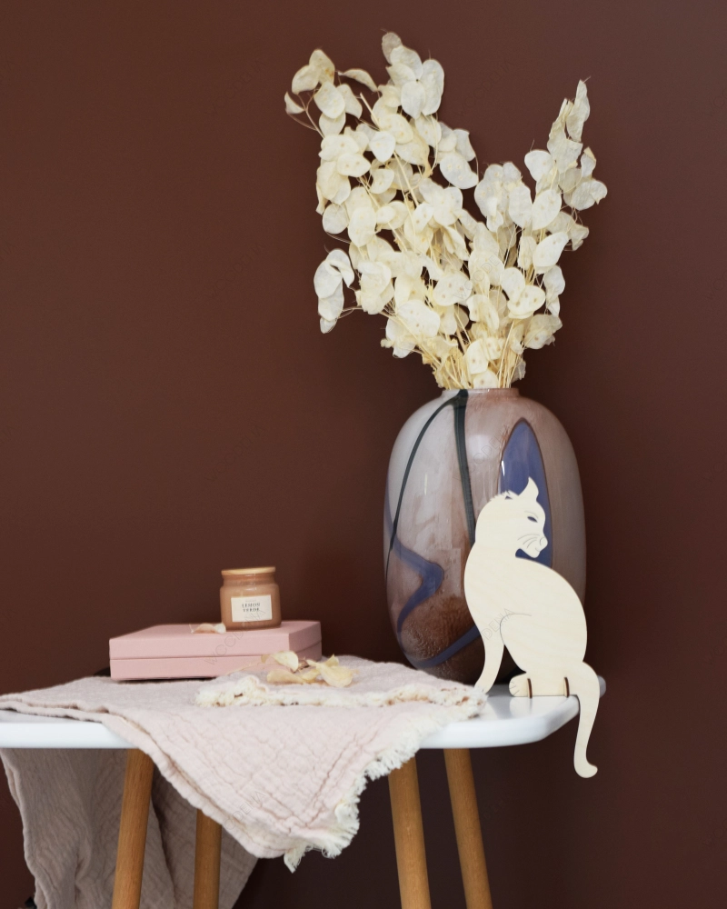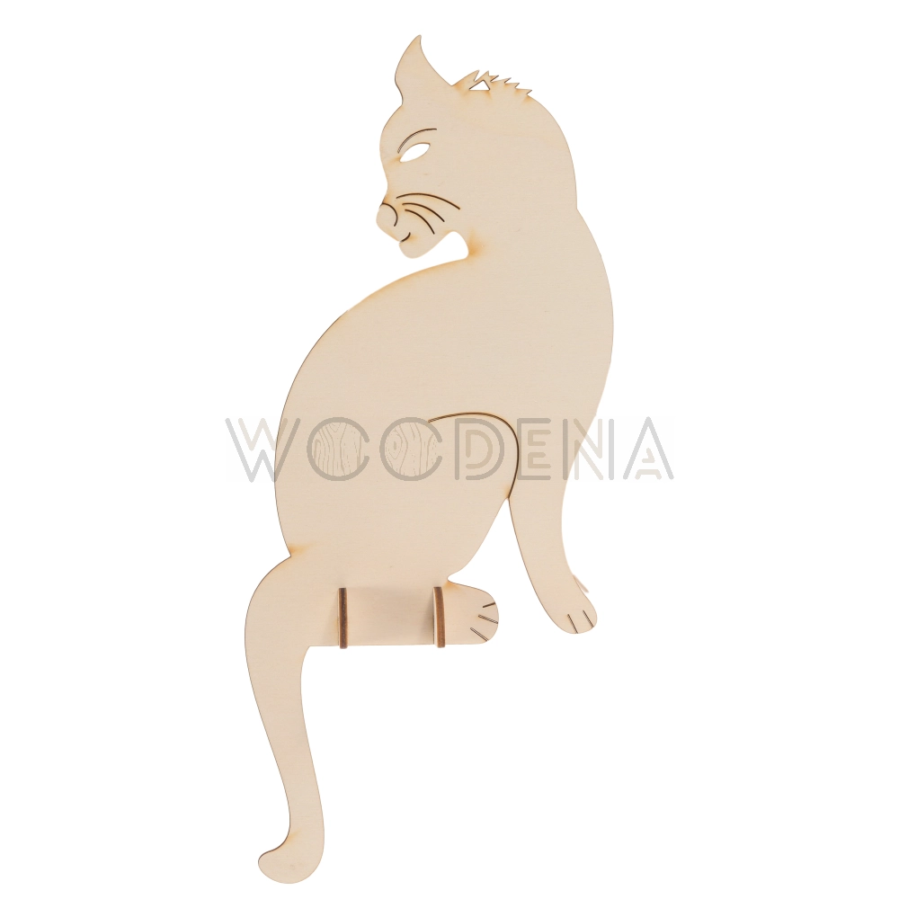 Drewniany kot na podstawkach to dekoracja do samodzielnego montażu, która została wykonana ze sklejki brzozowej. Figurka w postaci drewnianego kota posiada podstawki, które umożliwiają położenie dekoracji na płaskiej powierzchni, np. na biurku, stole, półce. Powierzchnia wycinanki jest gładka, dlatego może być dekorowana i malowana. Drewniany kot na podstawkach, ozdobiony według własnego pomysłu, będzie świetnym upominkiem dla osoby, która jest pasjonatem zwierząt. Drewniany kot może posłużyć jako baza do malowania techniką decoupage, mix-media, quilling.