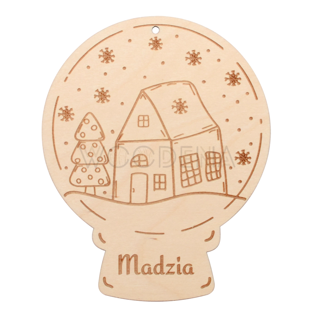 Kula śnieżna z drewna z imieniem i grawerowanym domkiem