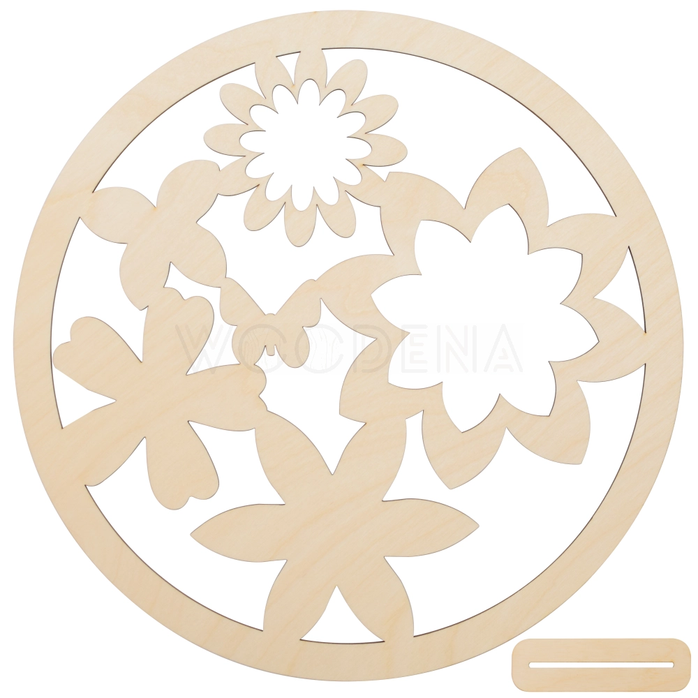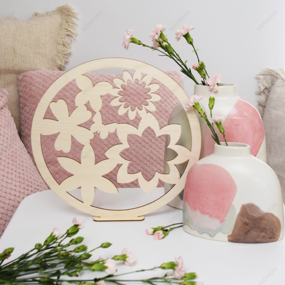 Drewniane kwiaty w kole są wykonane ze sklejki drewnianej.