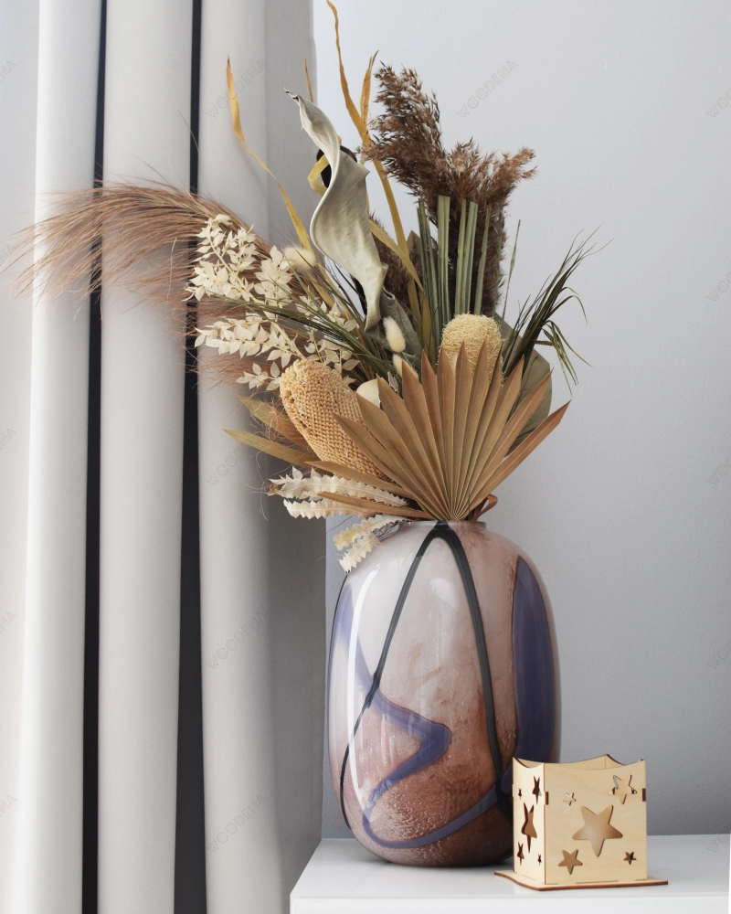 Dlatego przedstawiamy Nasz drewniany produkt, czyli lampion wykonany ze sklejki. Jest on czworokątem o falowanych brzegach na górze, przymocowany na drewnianej podstawie. Wycięte są na nim piękne gwiazdki o różnej wielkości, przez które pięknie przenika blask np. światełka na baterie.