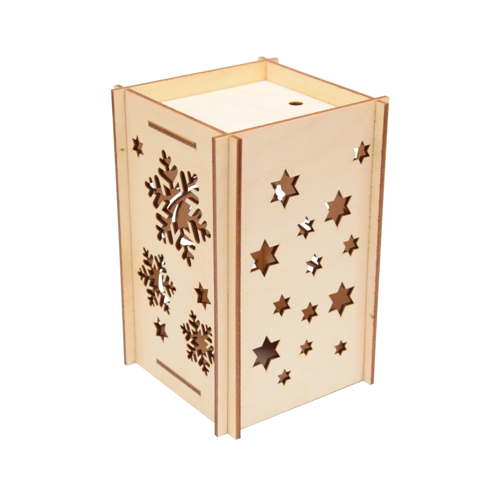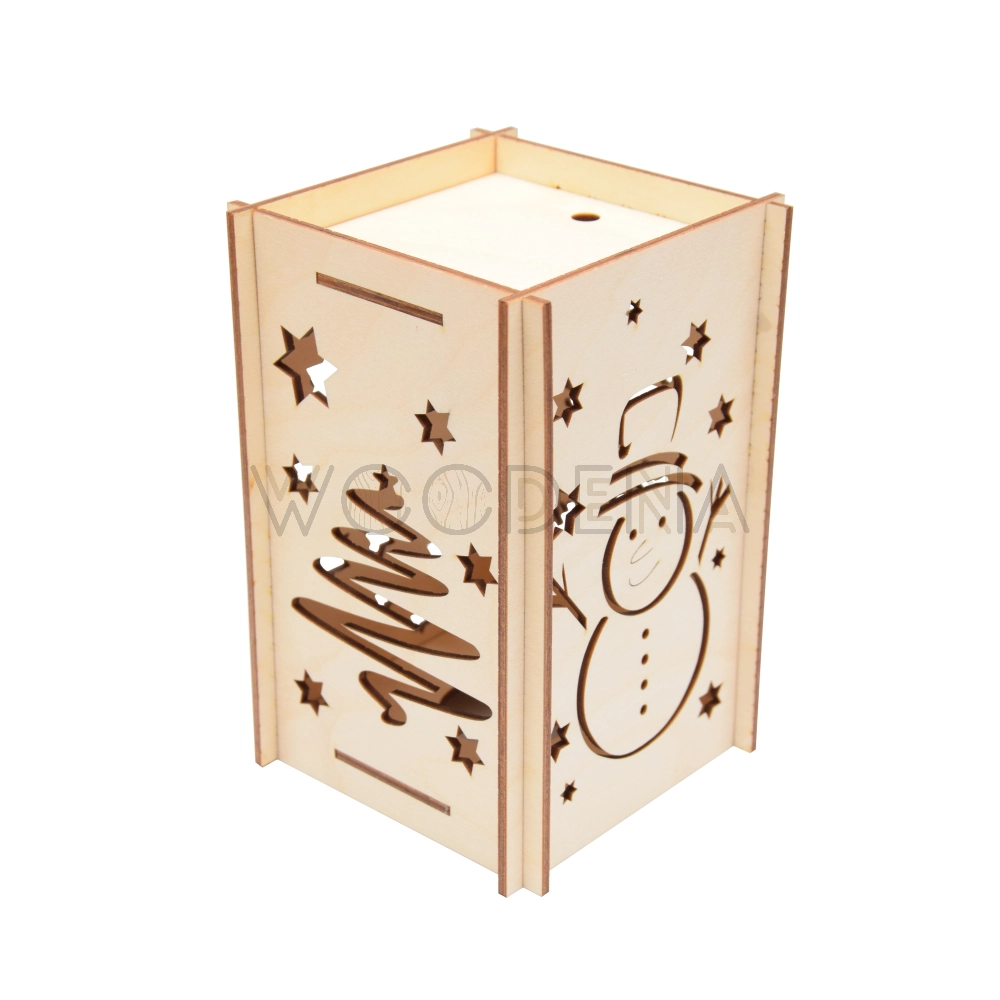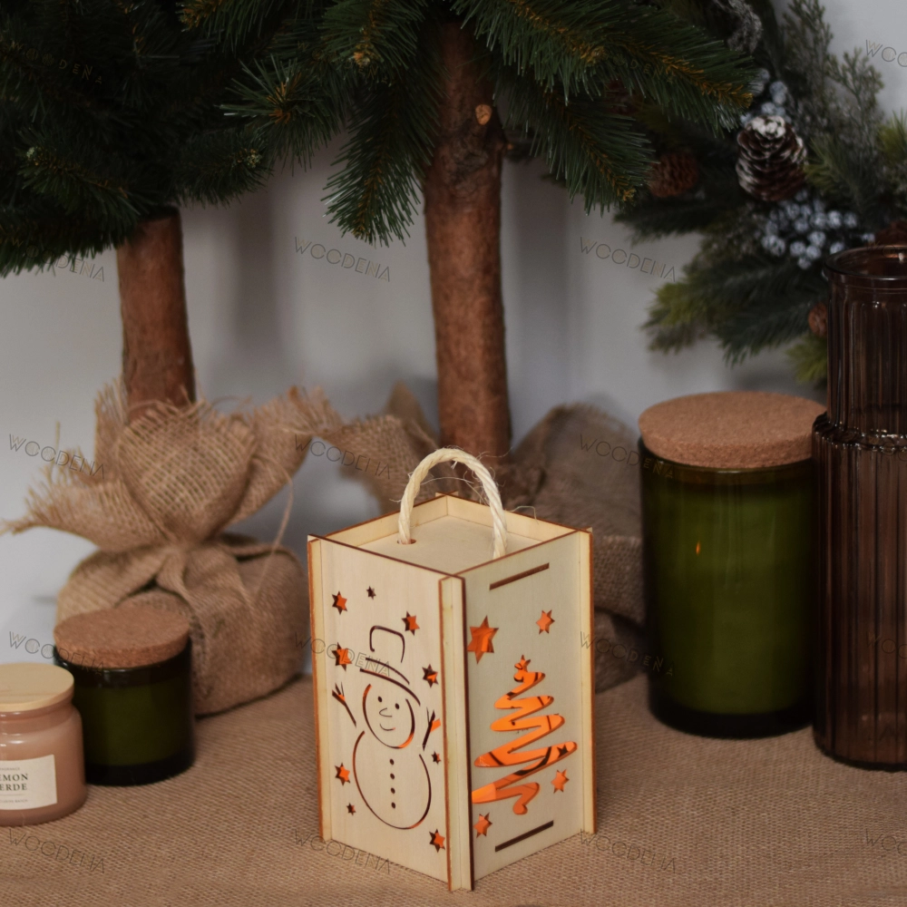 Lampion świąteczny ze sklejki posiada na swojej powierzchni Bożonarodzeniowe wzory, m.in. bałwanka, gwiazdki i choinkę. Kiedy włożysz do lampionu niewielką lampkę, wówczas światło odbija cień wzorów Świątecznych na ścianach, co nada niepowtarzalny klimat w trakcie Bożego Narodzenia. Lampion ze sklejki w postaci świątecznego domku może posłużyć jako element dekoracyjny wewnątrz budynku, jak również być wykorzystany jako lampion świąteczny zewnętrzny.