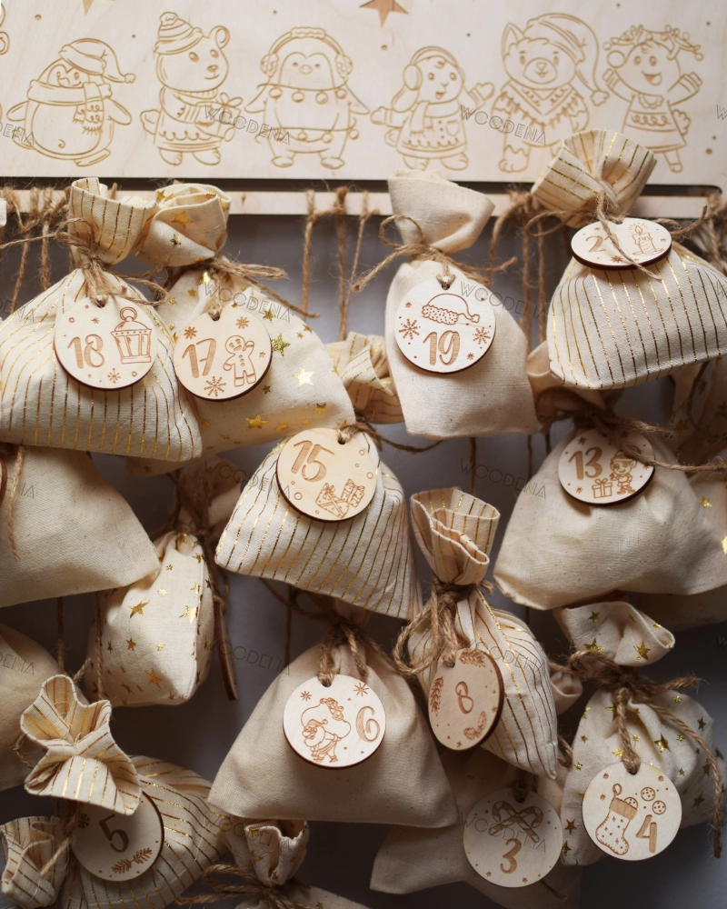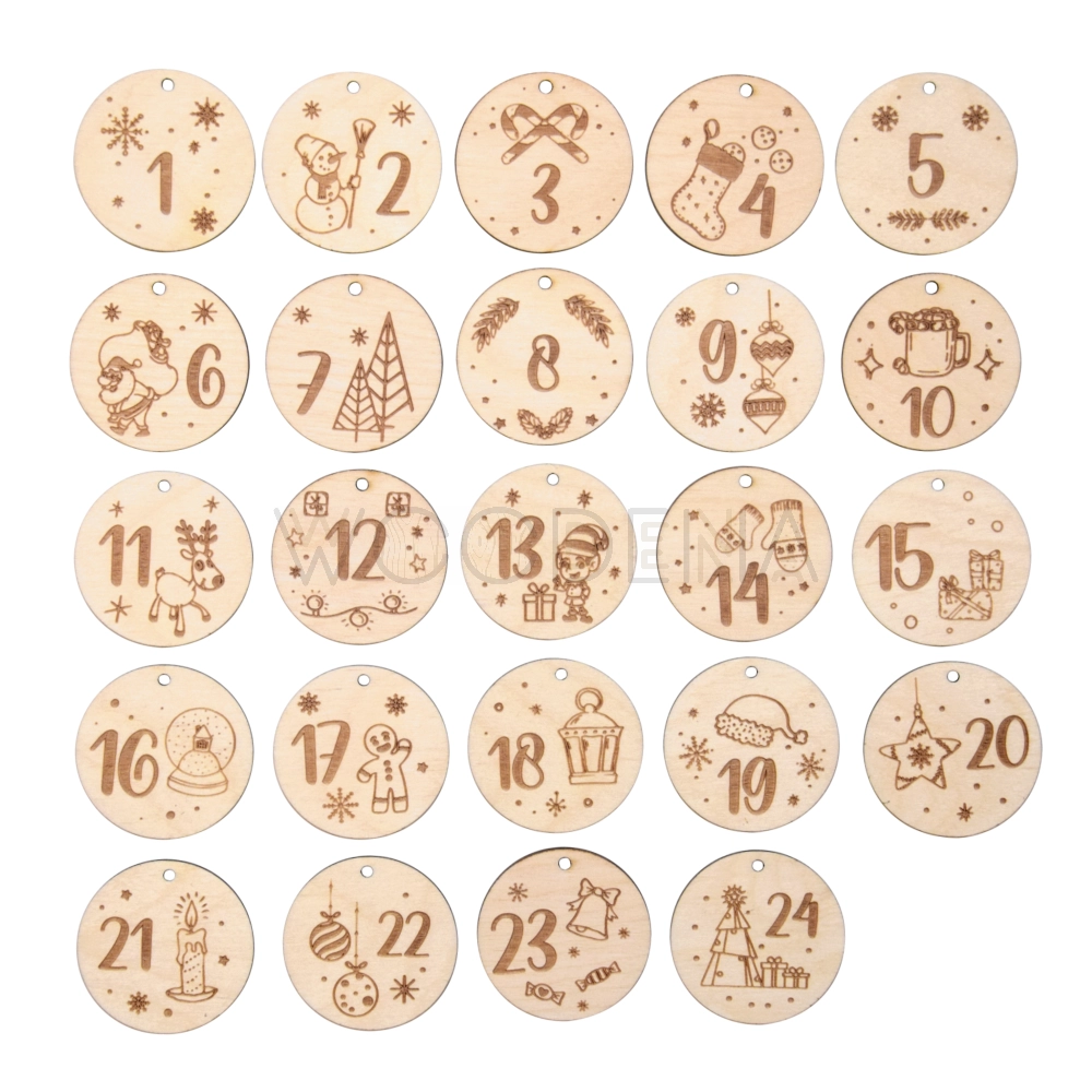 Zestaw składa się z 24 kółeczek o średnicy 4cm z grawerem. Każde kółeczko posiada wygrawerowaną liczbę od 1 do 24 i unikalną ozdobną grafikę. Każda cyferka została starannie wykonana. Dzięki temu, każdy egzemplarz jest unikalny i posiada swoje własne detale. To sprawia, że nasze drewniane cyferki są nie tylko piękne, ale także wyjątkowe.