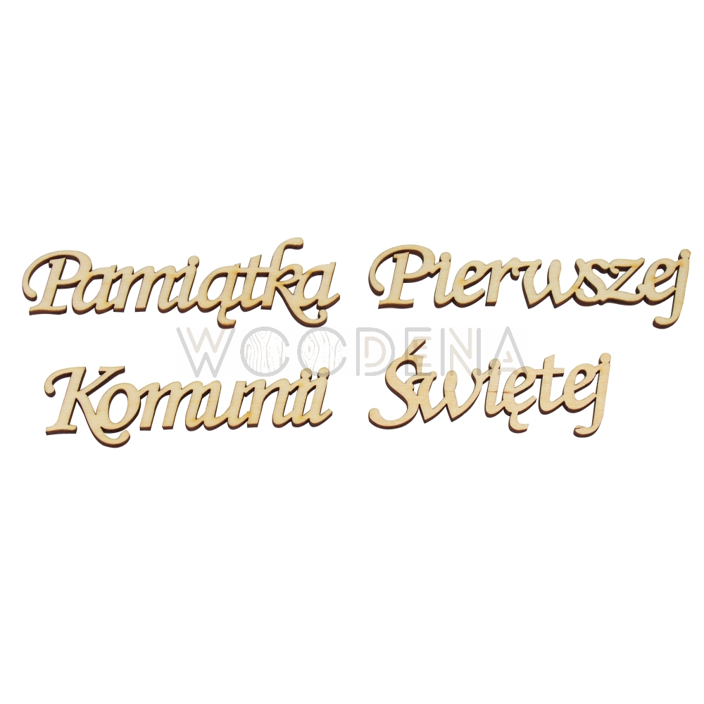 Drewniany napis „Pamiątka Pierwszej Komunii Świętej” wykonany ze sklejki brzozowej. Drewniany napis komunijny to doskonały element dekoracyjny, który może być naklejony na prezent komunijny, bukiet z kwiatami czy kartkę z życzeniami.