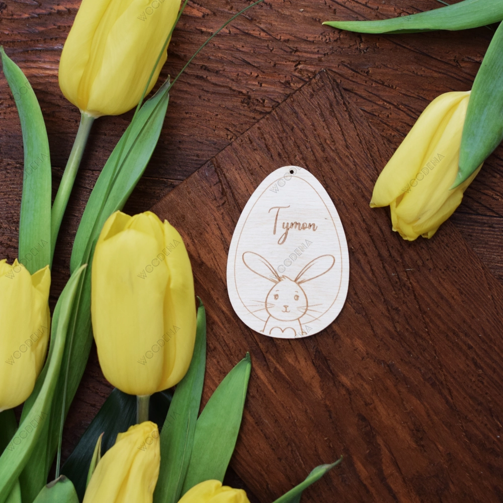 Zawieszka wykonana jest ze sklejki brzozowej. Ma kształt jaja-pisanki, na którym wygrawerowany w drewnie jest kształt zajączka idealny na tę okazję oraz wybrany przez Was personalizowany napis.