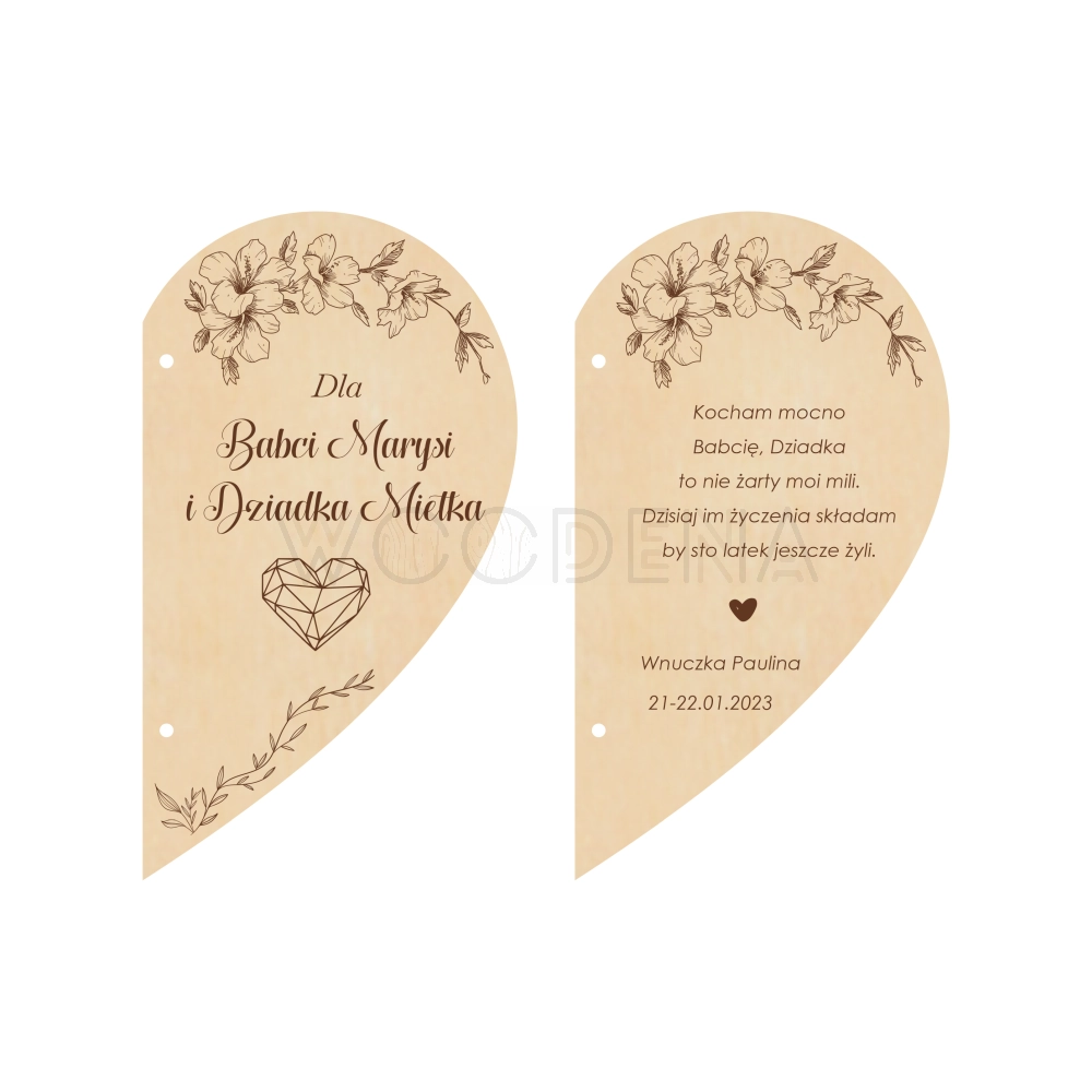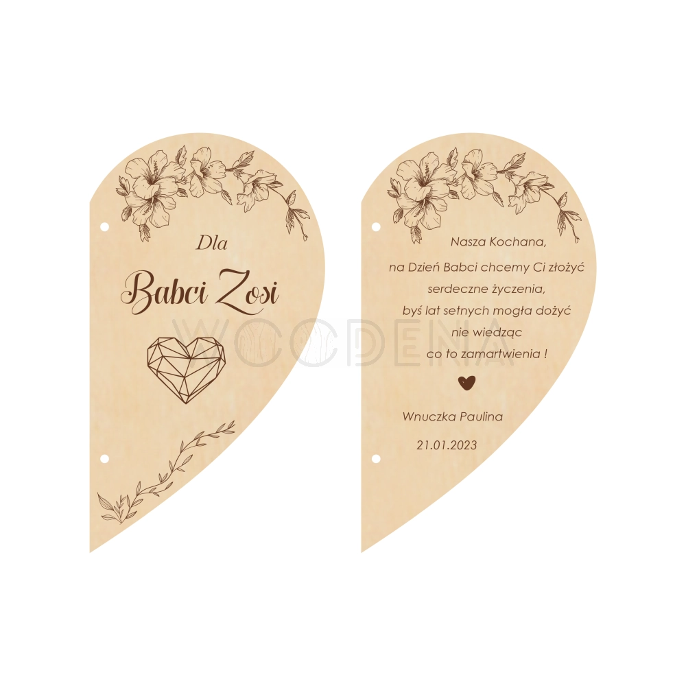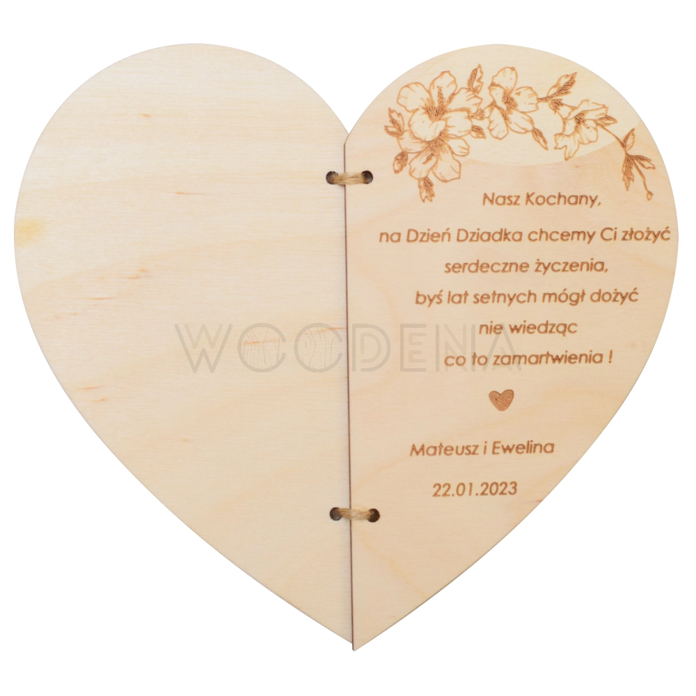Ponadto kartka serce jest personalizowana, co oznacza, że może zawierać Wasze imiona oraz imiona Waszych Dziadków! Dzięki temu serduszkowy upominek z pewnością przyniesie jeszcze więcej radości i będzie przepiękną pamiątką. Co więcej, na kartce ze sklejki brzozowej są także życzenia dla Babci i Dziadka oraz piękne grafiki, pasujące idealnie do okazji.