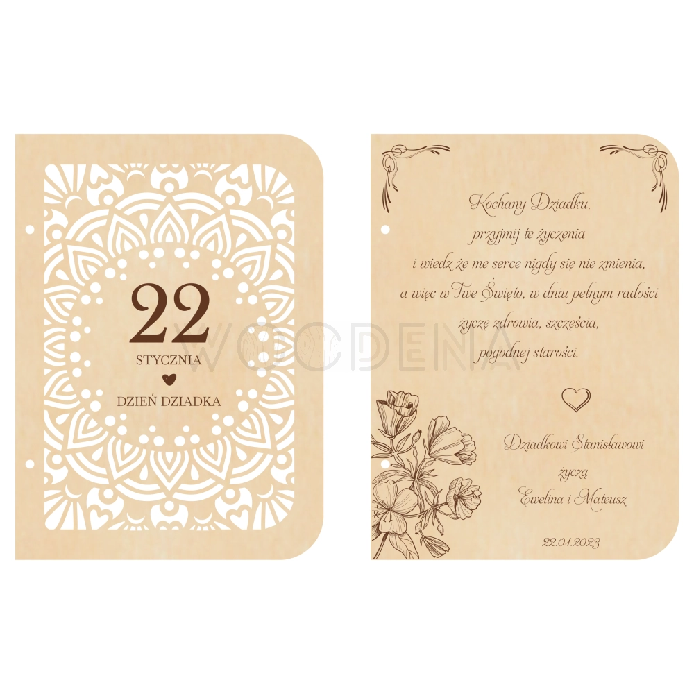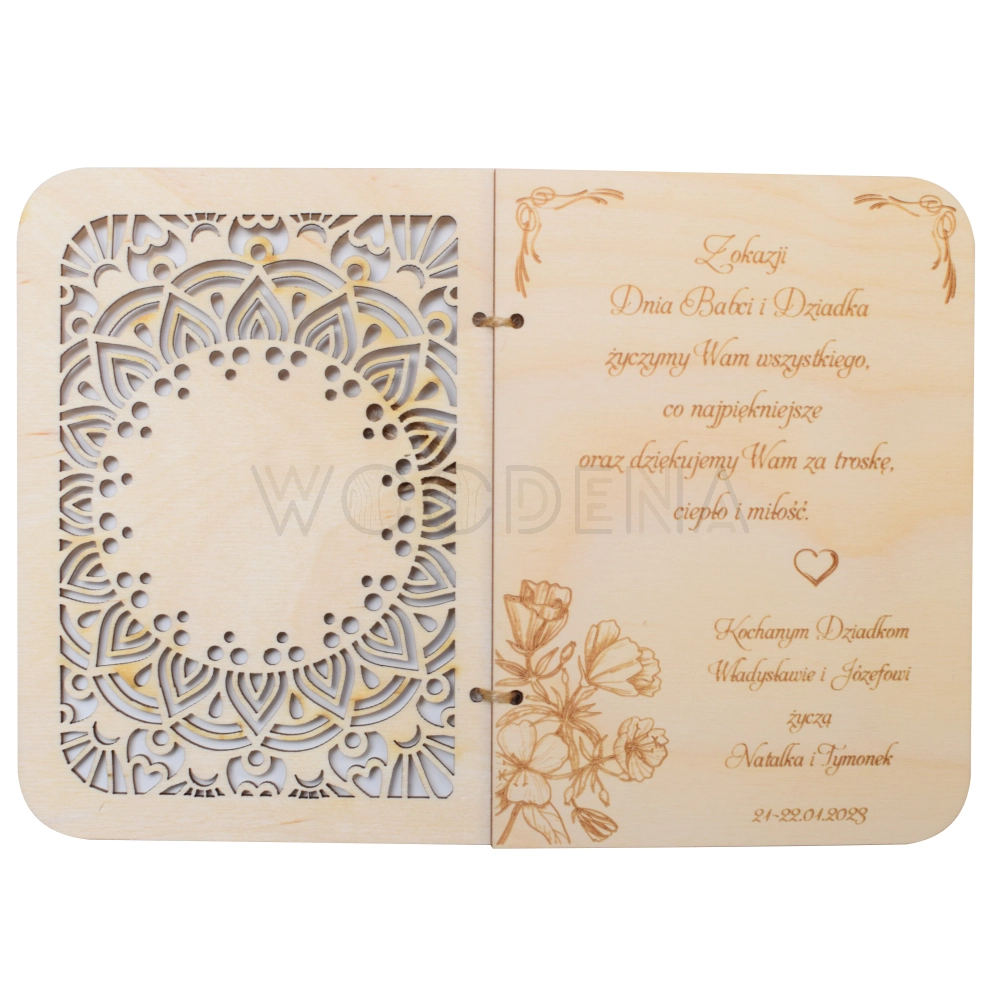 Drewniana kartka z życzeniami ma dużo wyciętych wzorów, dzięki czemu pięknie i oryginalnie się prezentuje.