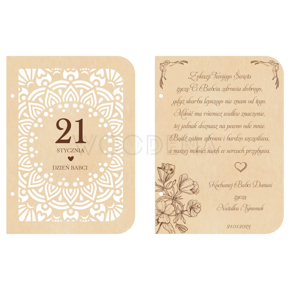 W naszym asortymencie znajdziecie wiele produktów drewnianych, które idealnie pasują na prezent z okazji Dnia Babci i Dziadka. Jednym z pomysłów na prezent bądź dodatkiem do prezentu może być kartka z życzeniami na Dzień Babci i Dziadka wykonana ze sklejki brzozowej.