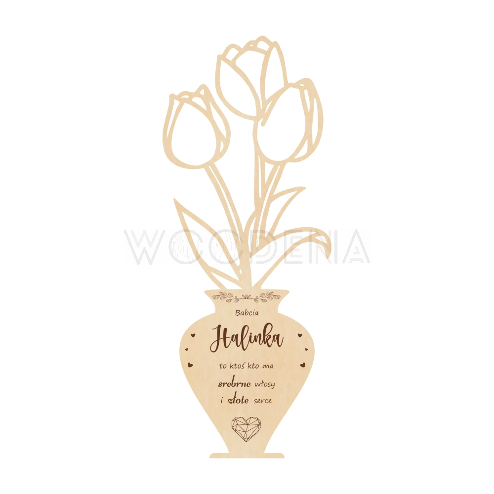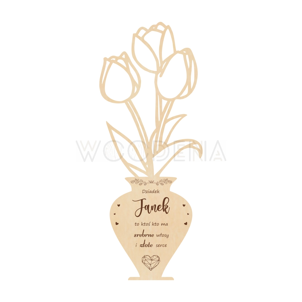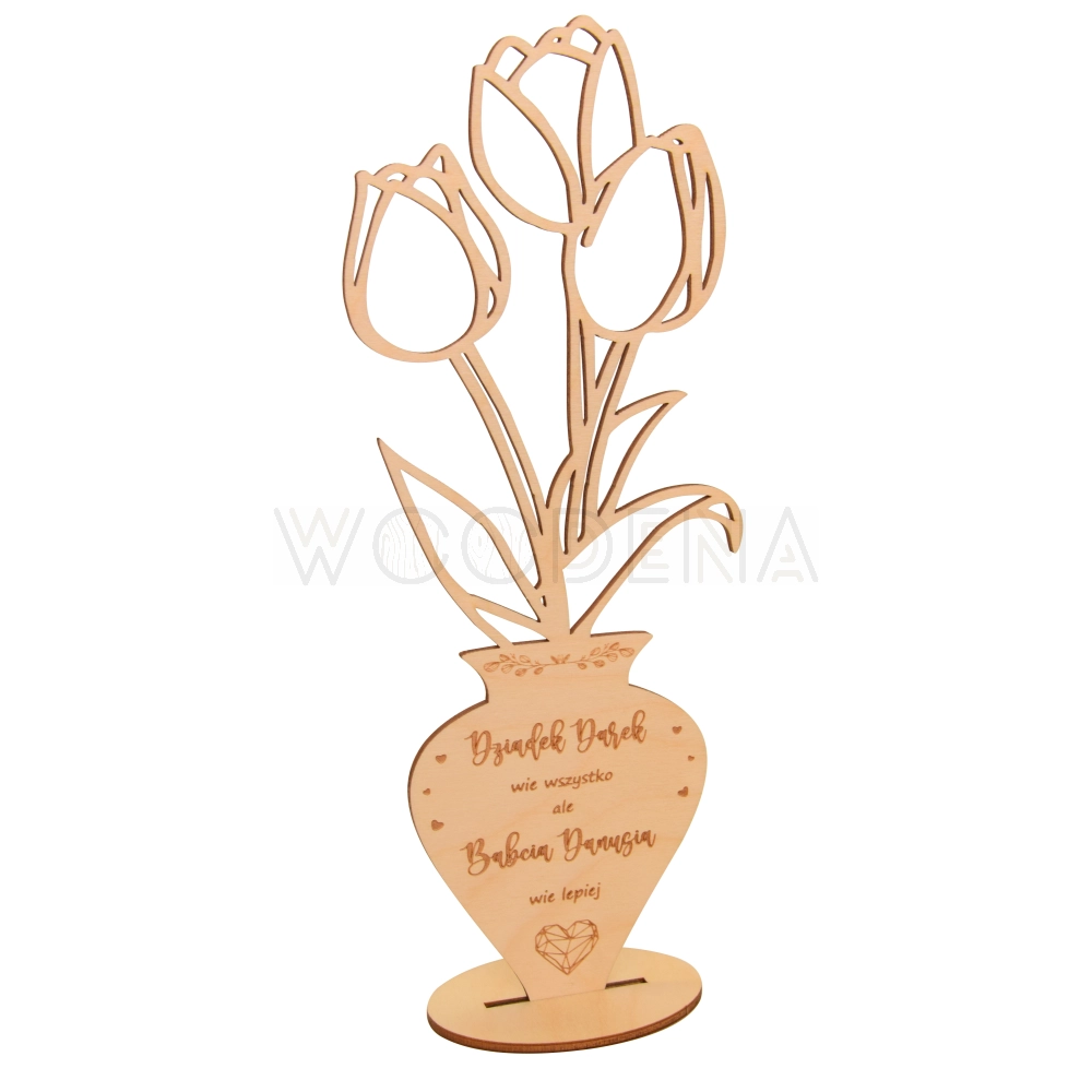 Trzy drewniane tulipany z wazonikiem, na którym znajdują się życzenia dla Babci i Dziadka to ciekawy pomysł na prezent z okazji ich święta! Upominek ze sklejki brzozowej może być ciekawą alternatywą dla zwykłego bukietu kwiatów.