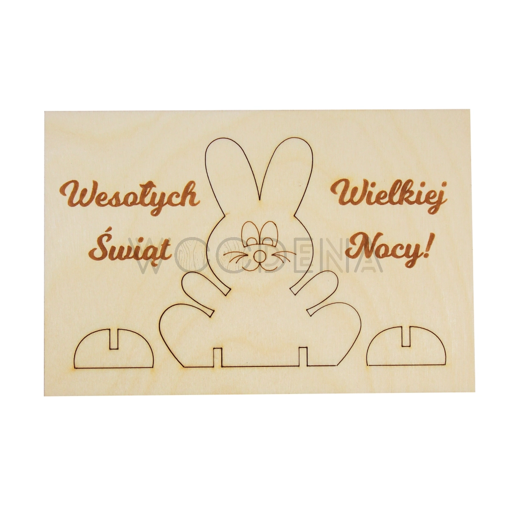 Drewniana kartka wielkanocna wykonana ze sklejki drewnianej. Kartka świąteczna to doskonały prezent wielkanocny dla bliskiej osoby. Na powierzchni dekoracji znajdują się życzenia oraz wycięty króliczek wielkanocny, którego można wyjąć, samodzielnie złożyć, a następnie postawić w formie dekoracyjnej figurki. Drewniana pocztówka wielkanocna ze sklejki sprzedawana jest w surowej formie, która doskonale komponuje się do nowoczesnych, jak i klasycznych wnętrz.