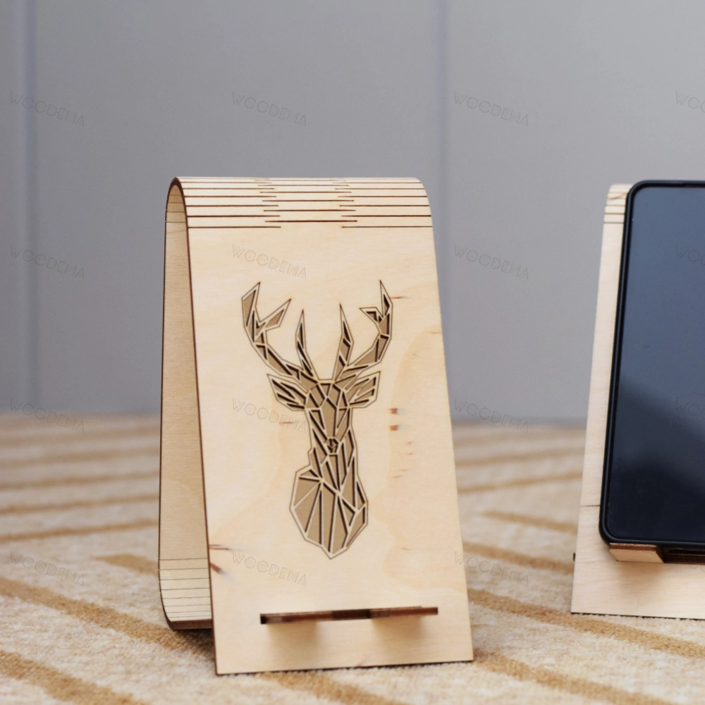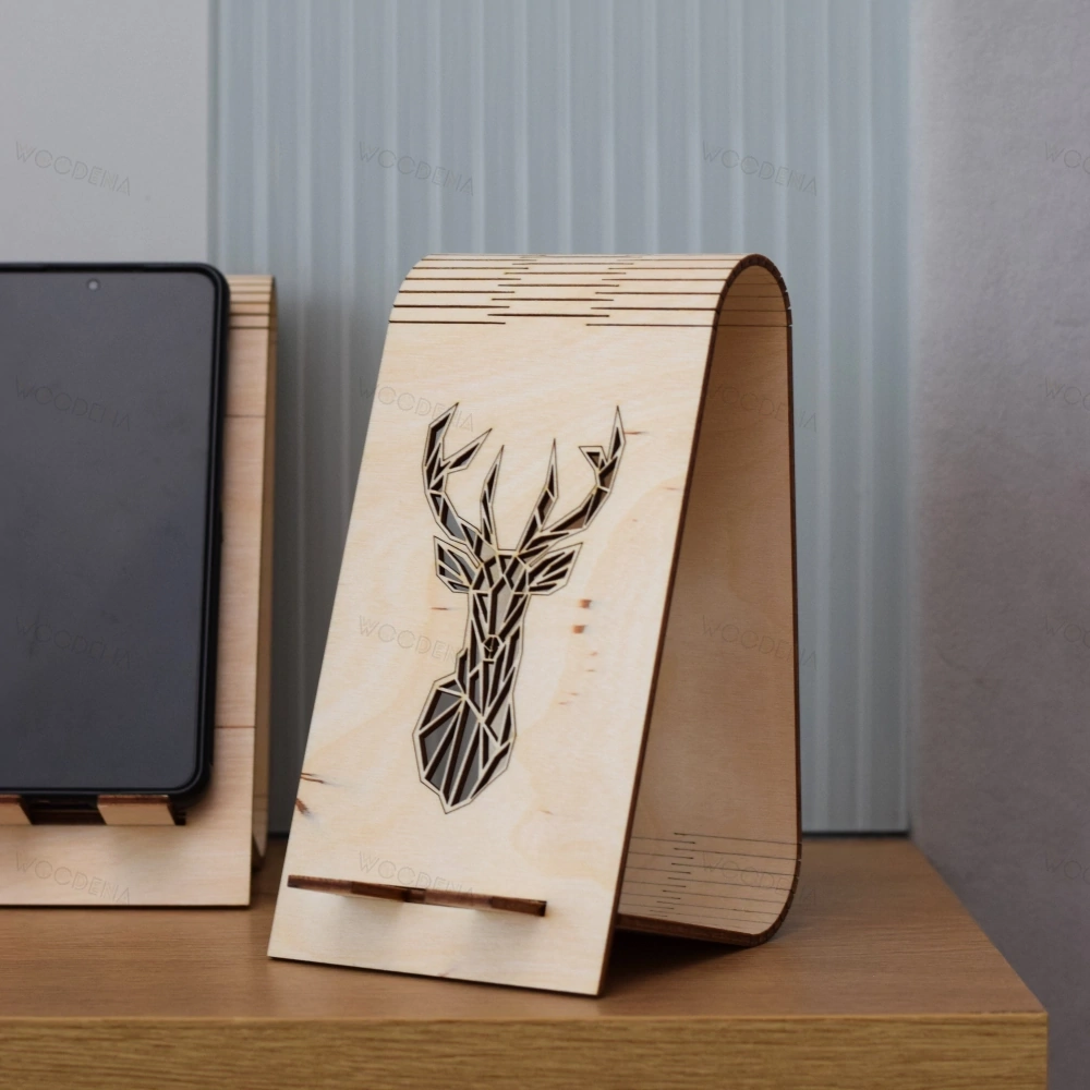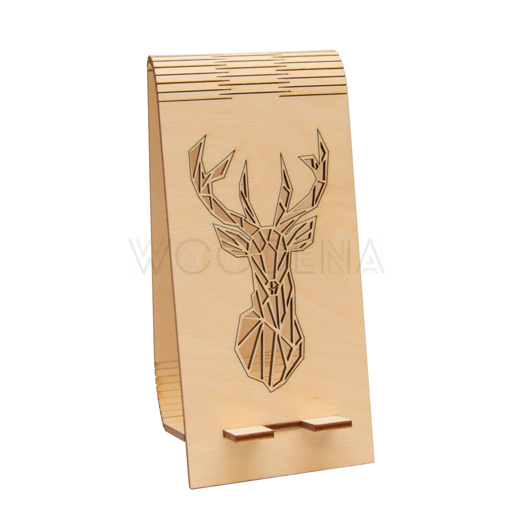 Świetnie trafiliście! Jako producenci wyrobów z drewna proponujemy drewniany stojak na telefon! I to nie taki zwyczajny, lecz urozmaicony wzorem w postaci geometrycznego jelenia!