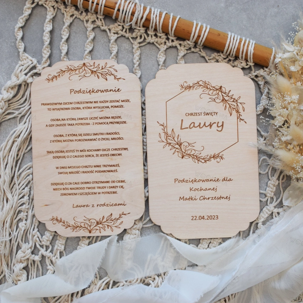 Jeśli szukasz trwałego, naturalnego i osobistego podziękowania dla rodziców chrzestnych, nasze drewniane produkty są idealnym wyborem. Wykonane ze sklejki drewnianej, z możliwością personalizacji, będą stanowić piękną pamiątkę na wiele lat. Zamów teraz i obdaruj swoich bliskich czymś wyjątkowym!