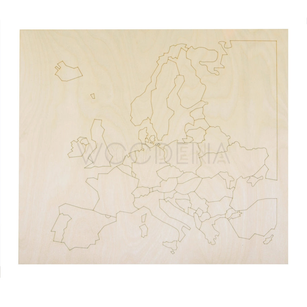 Drewniana mapa Europy wykonana jest z naturalnej sklejki brzozowej. Puzzle drewniane dla dzieci, młodzieży i dorosłych posiadają wyciągane elementy i składają się z dwóch niesklejonych ze sobą warstw, co ułatwia ich ponowną rozbiórkę i ćwiczenia.