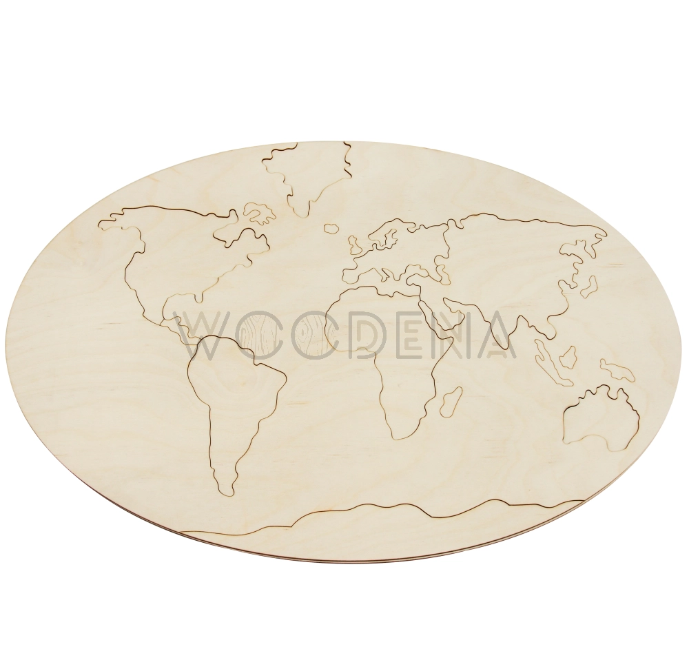 Mapa Świata ze sklejki drewnianej składa się z dwóch owalnych 3mm warstw: dolnej i górnej. Górna warstwa to owalna plansza, a w niej 8 puzzli będących kontynentami świata.
