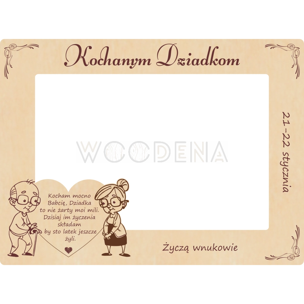 Tutaj przedstawiona ramka jest prostokątna. Zawiera piękną grafikę Babci oraz Dziadka, przy której jest piękne serce, na którym napisane są życzenia. Jednak życzenia to nie wszystko! Ramka zawiera także datę tego wyjątkowego dnia.