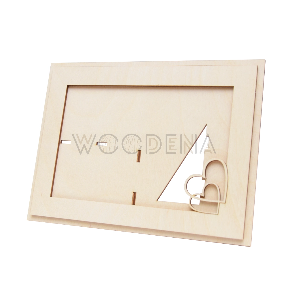 Drewniana ramka na zdjęcie z serduszkami wykonana z wysokiej jakości sklejki drewnianej. Ramka Woodena posiada dekorację w kształcie serduszek, co dodatkowo ozdabia zdjęcie i nadaje unikalnego wyglądu. Fajny pomysł na prezent dla ukochanej osoby. Drewniana ramka pasuje do zdjęć w formacie 10x15cm (10x15 cm to wymiar wewnętrznego okienka). Podpórkę ramki można zamontować w dwóch miejscach, dzięki czemu ramkę można postawić wedle uznania - pionowo albo poziomo.