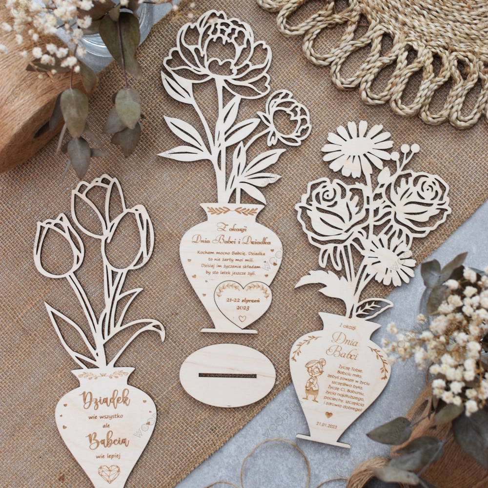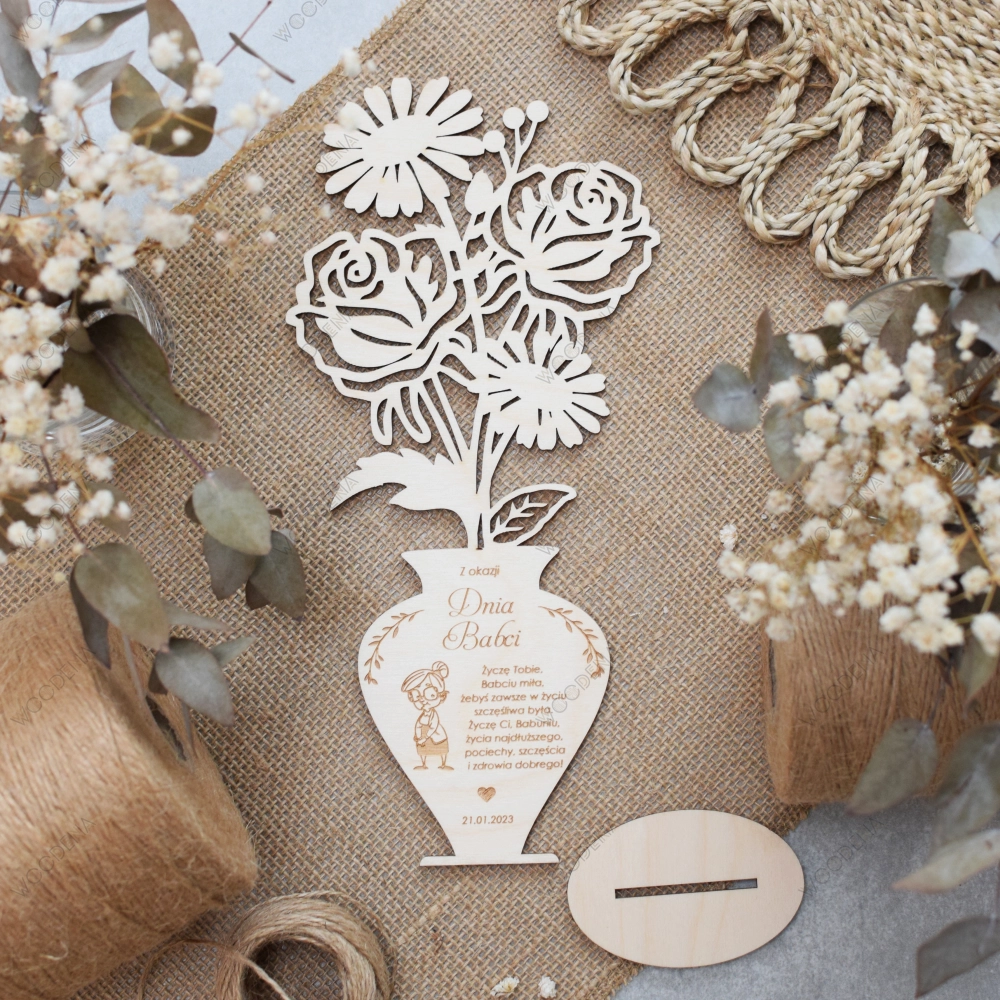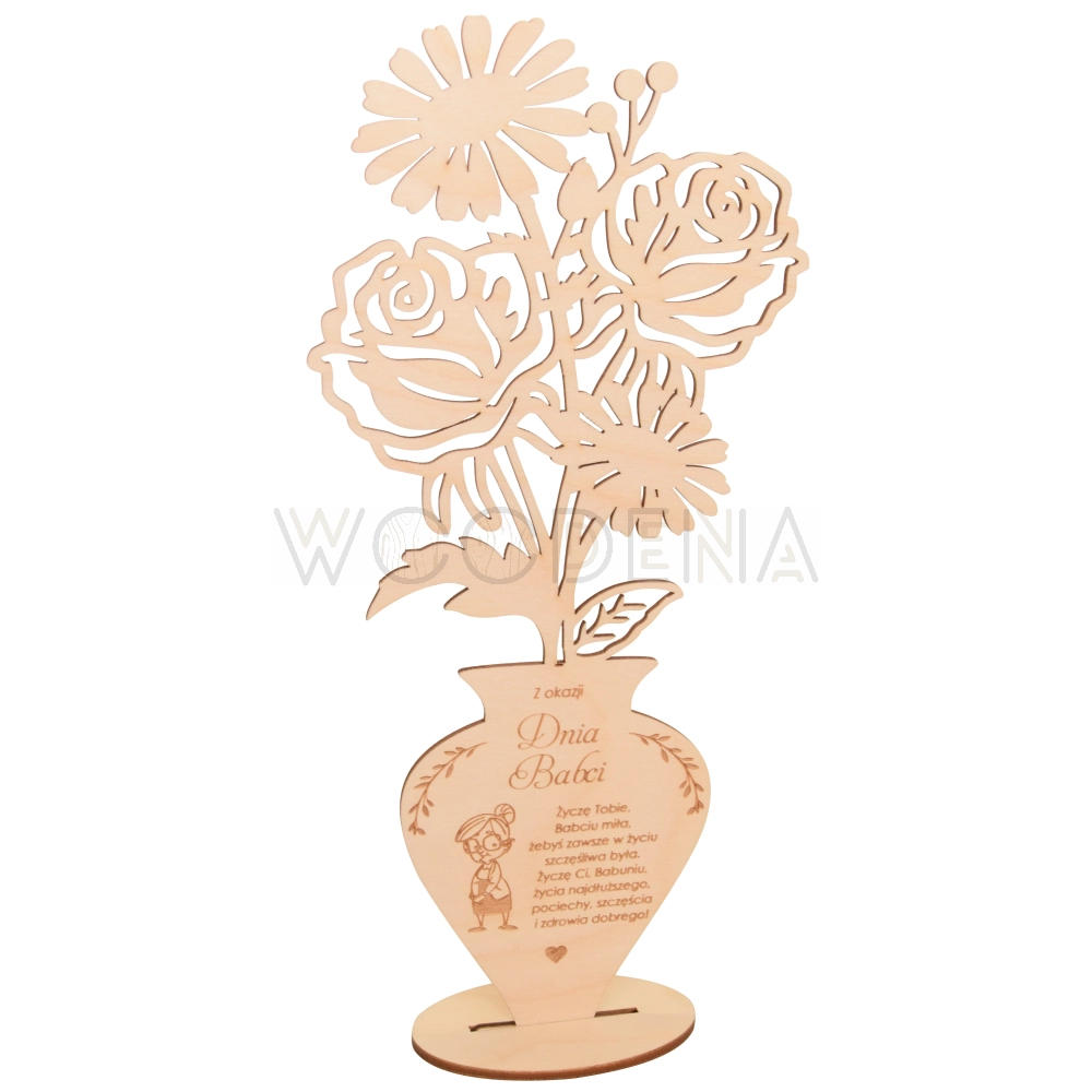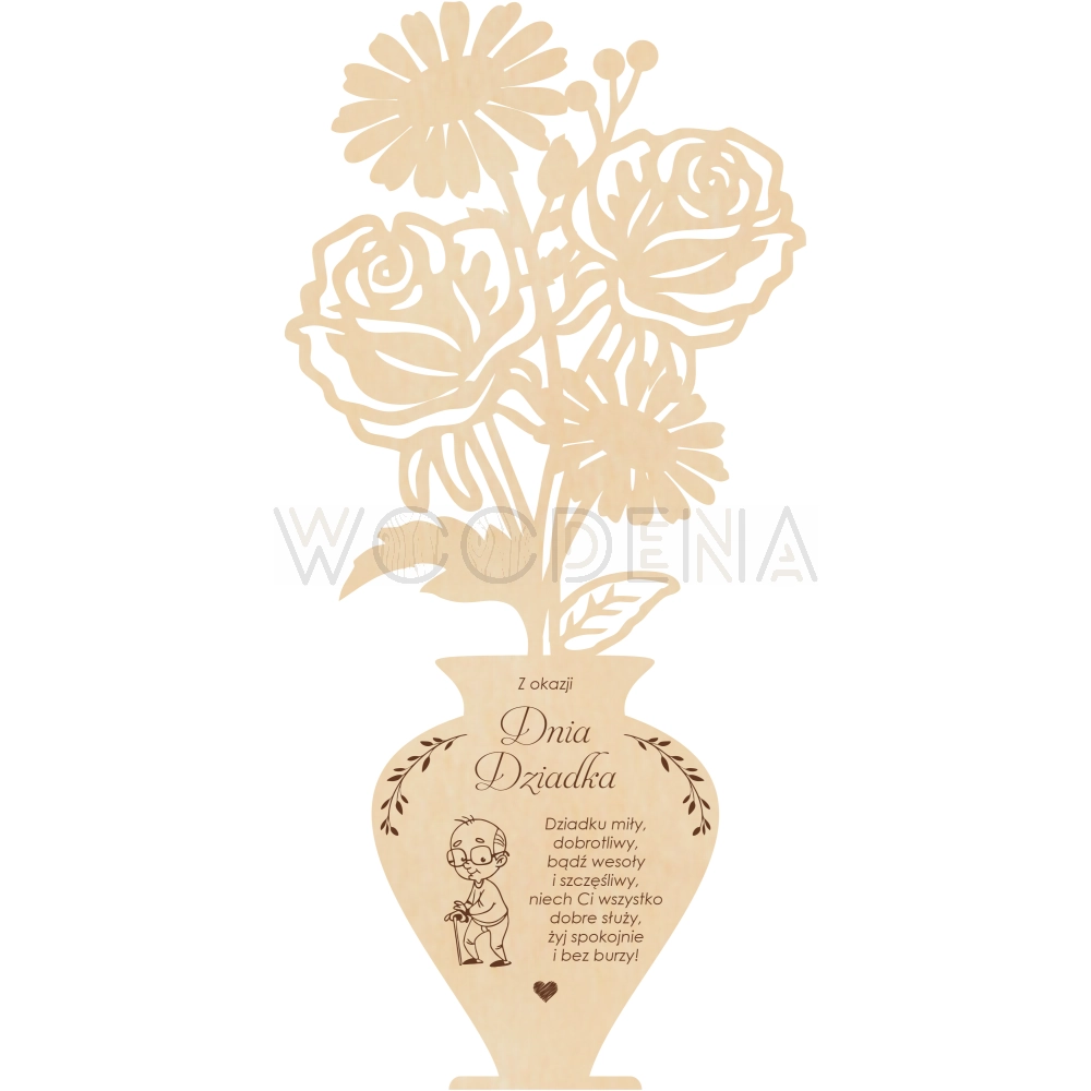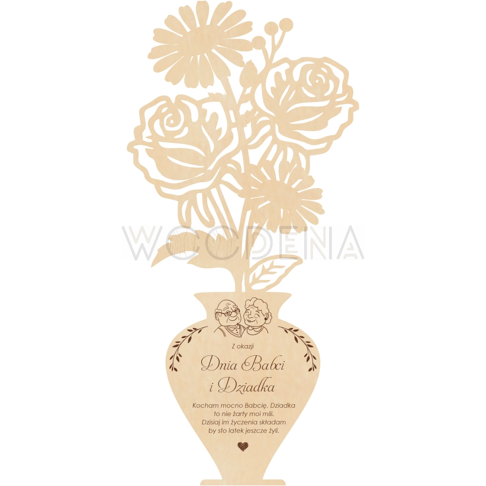 Tutaj przedstawiamy — Drewniane róże w pięknym drewnianym wazonie, na którym zawarte są życzenia dla Babci i Dziadka.
