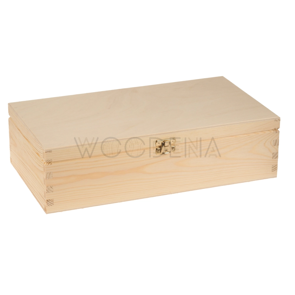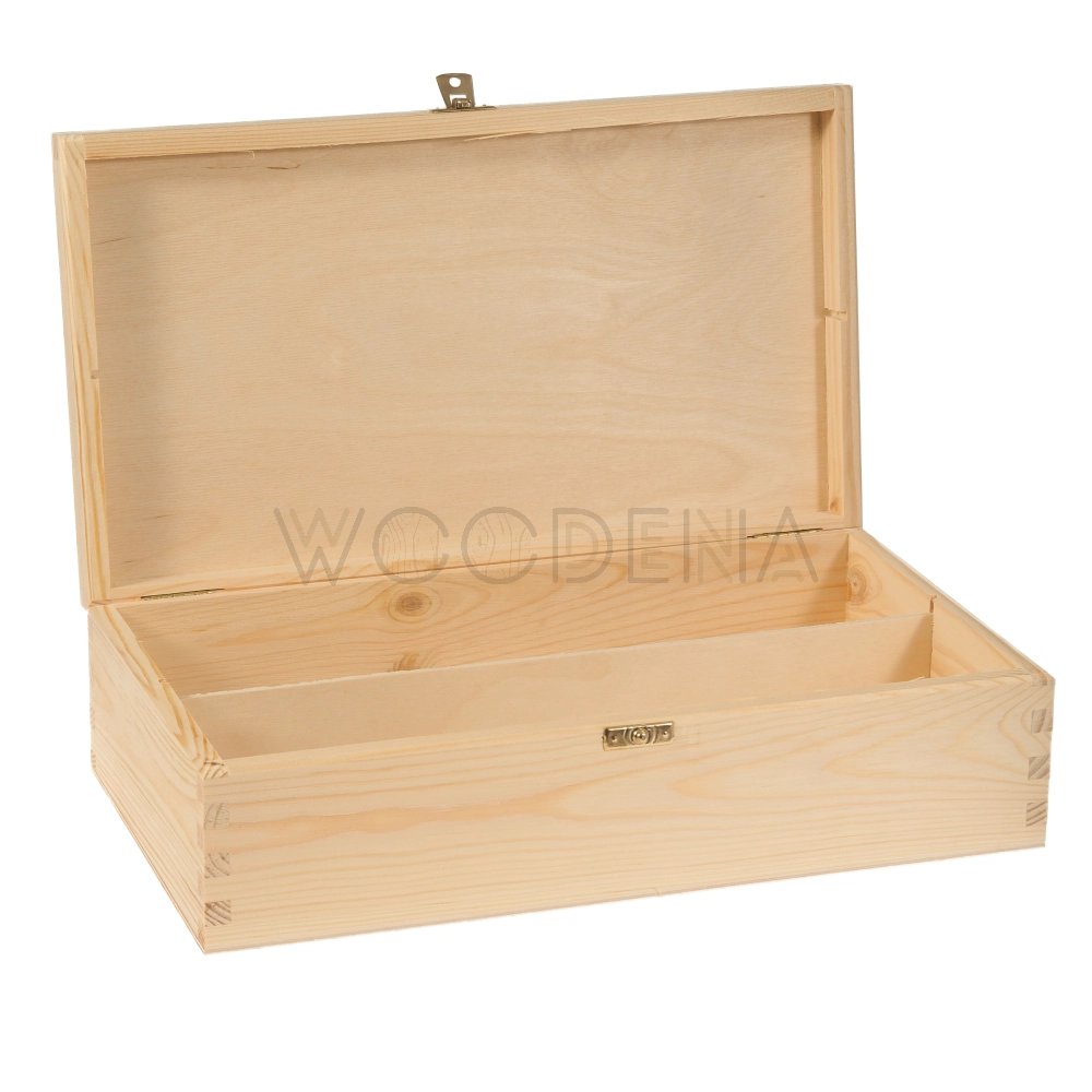 Wymiar wewnętrzny: 33,9 x 18,1 x 9,5 cm (7,5 cm głębokości ma podstawa skrzynki + 2 cm głębokości ma pokrywa). Przegródka wewnątrz rozdziela pudełko na dwie komory o szerokości 8,9 cm każda. Przegródka jest wyjmowana.