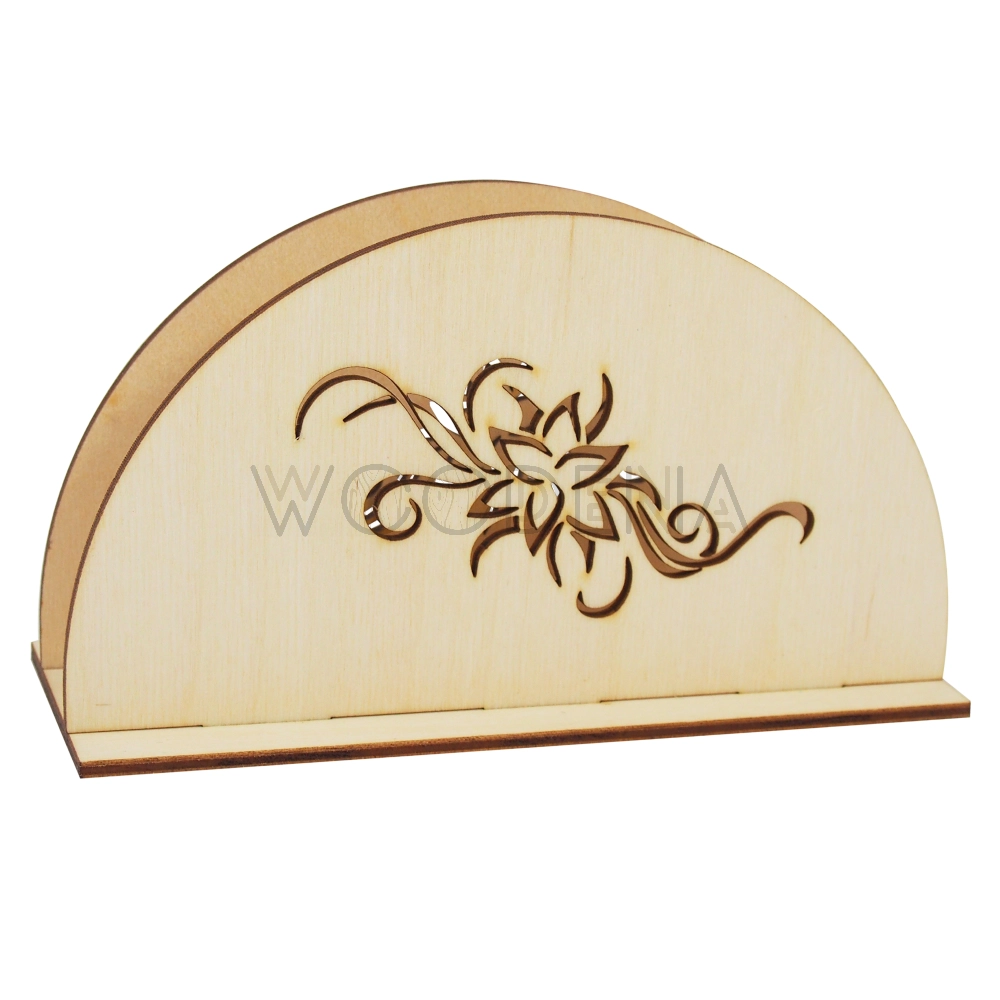 Stojak na serwetki wykonany jest ze sklejki. Kształt stojaka jest półokrągły a jego podstawa prostokątna. Widnieje na nim wycięty wzór kwiatka. Całość przedstawia się lekko i naturalnie.