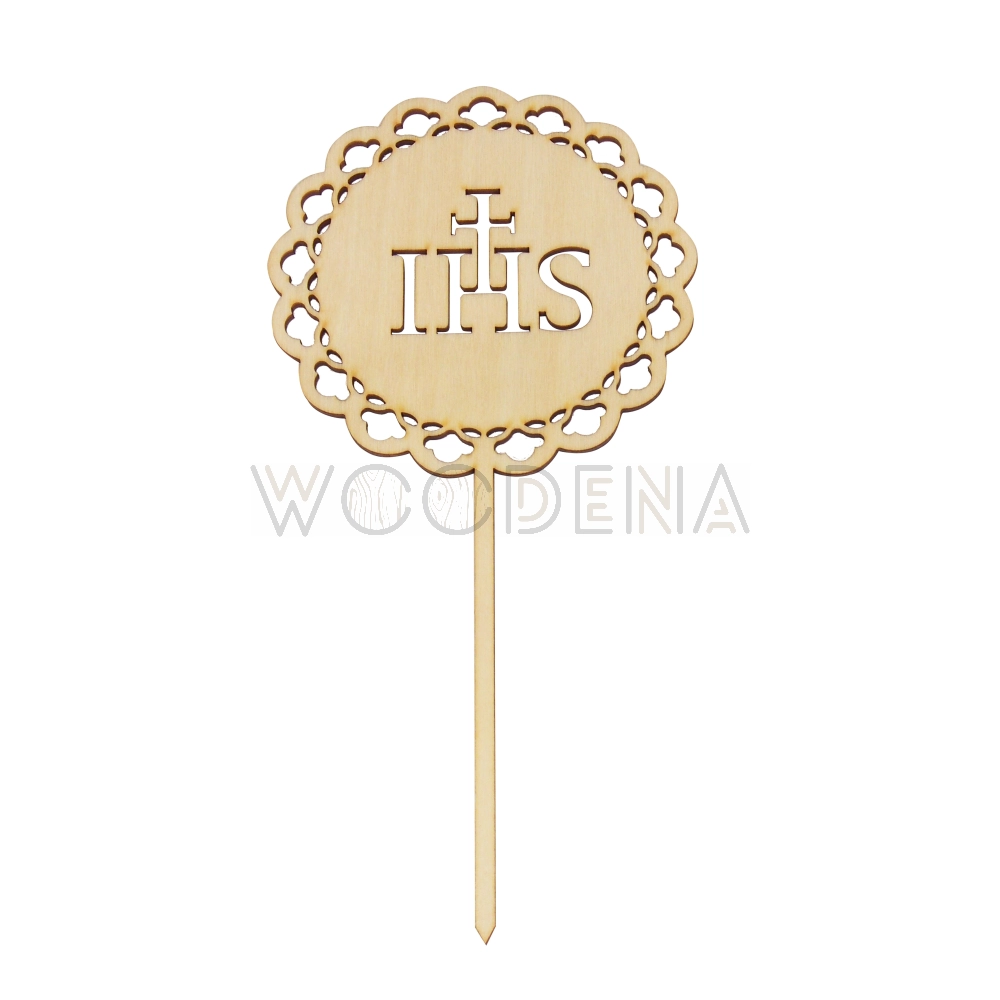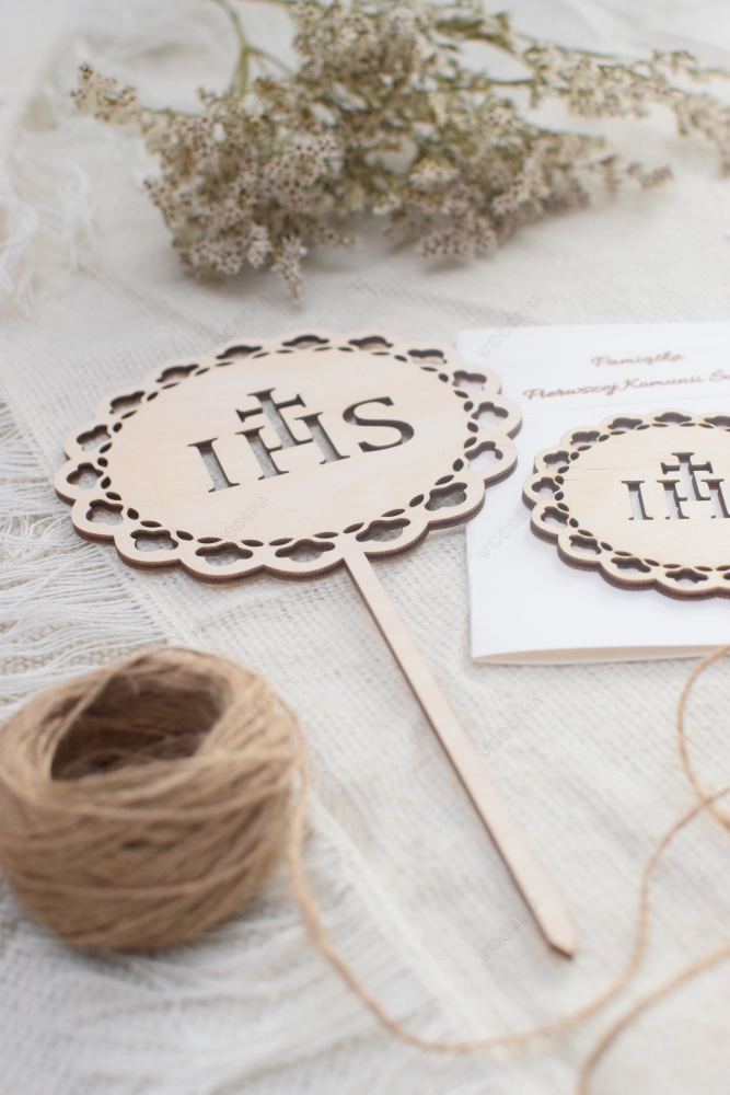 Drewniany Topper na tort w postaci hostii to przepiękna ozdoba, idealna do dekoracji tortu lub stroików komunijnych. Drewniany Topper na komunię może być użyty jako ozdoba do bukietu. Naturalne wykończenie dekoracji będzie doskonale pasować do wnętrz w stylu: