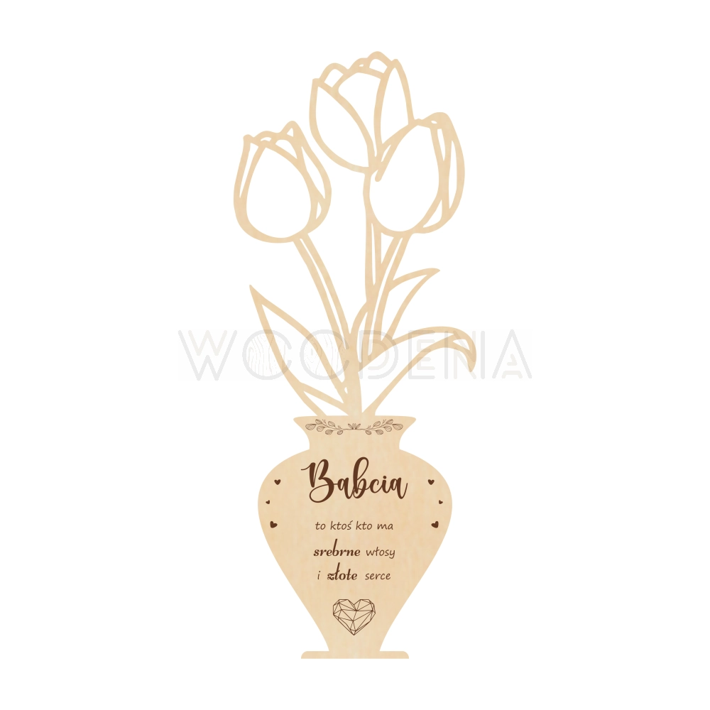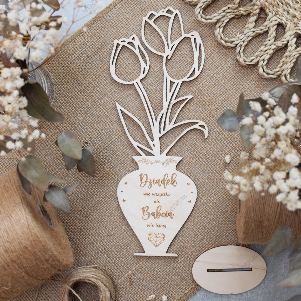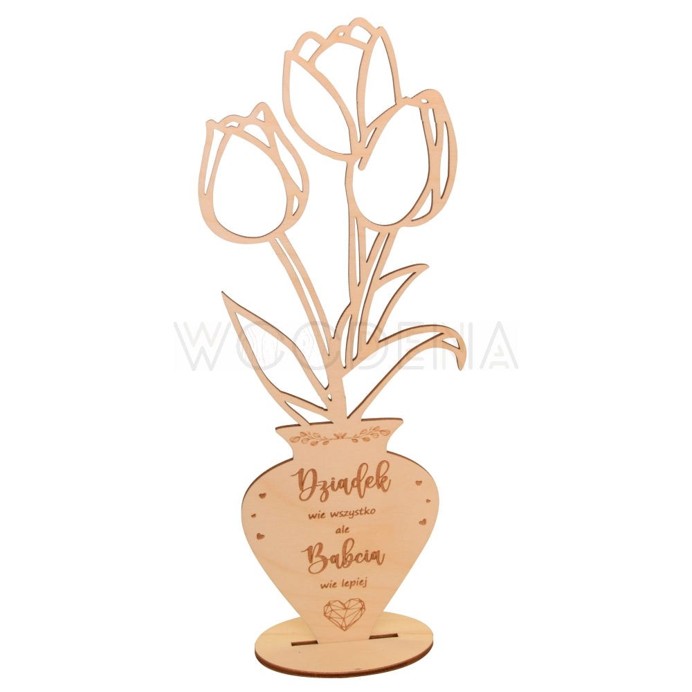 Bukiet właśnie takich drewnianych kwiatów wygląda tak, jakby był umieszczony w wazonie. Wazon ten zawiera dodatkowo piękne napisy oraz grafikę. Jeśli zatem Wasi Dziadkowie lubią tulipany, to te z pewnością nie zwiędną po kilku dniach, tylko będą pamiątką na długie lata.