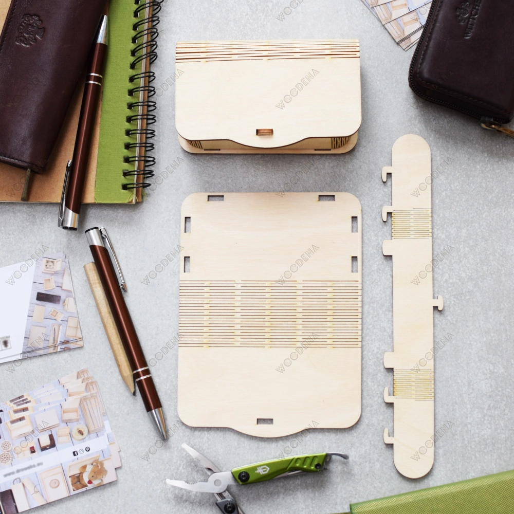 Stojak na wizytówki drewniany wykonany jest z naturalnej sklejki z drewna brzozowego. Wytrzymała sklejka sprawia, że drewniane etui na wizytówki jest trwałe i odporne na uszkodzenia. Pudełko zapewnia przechowanie wielu wizytówek.