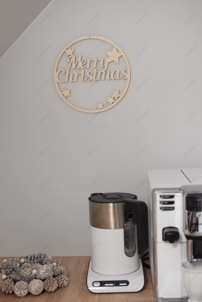 We present a fairly large, round, wooden wreath, in the middle of which the inscription "Merry Christmas" is displayed, surrounded by stars of various sizes. The decoration is made of birch plywood and will fit in practically any room in the house! If the decoration is too raw or natural for you, you can confidently try your hand at decorating such a wreath!