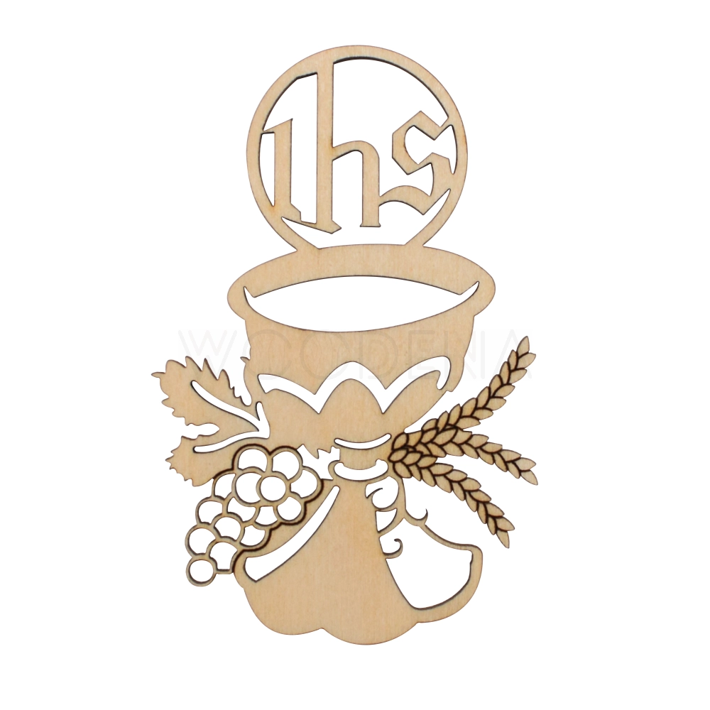 Drewniany kielich komunijny IHS to śliczna ozdoba komunijna, która doskonale sprawdzi się jako element dekoracyjny do kartek komunijnych. Dekoracja komunijna została wykonana z naturalnej sklejki drewnianej. Przedmiot może zdobić w swojej naturalnej, surowej postaci, jak również zostać pomalowany i udekorowany według własnego pomysłu.