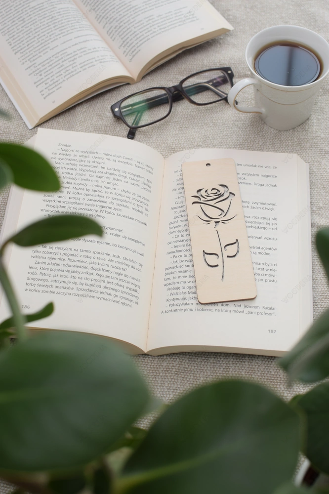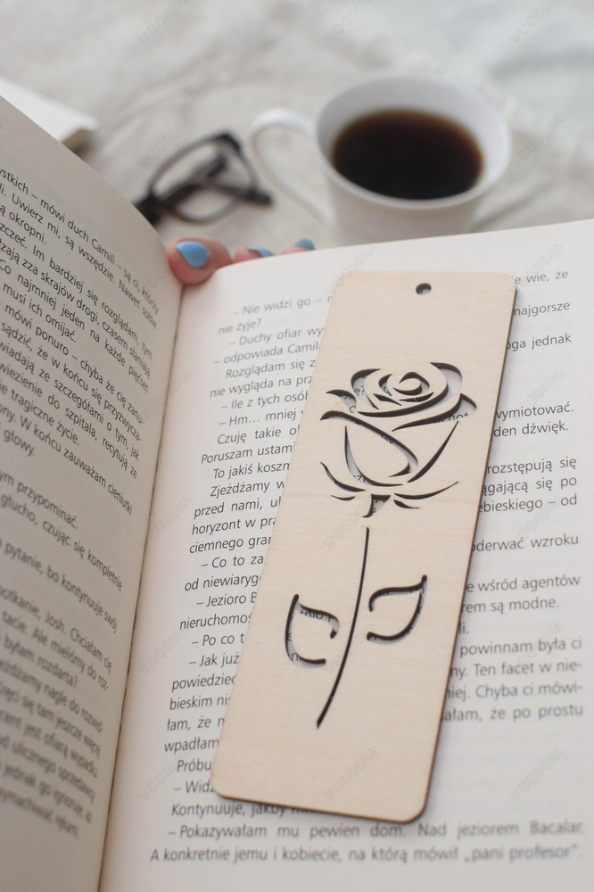 Tym razem jest to zakładka drewniana w kształcie prostokąta, z wyciętym wzorem róży! Piękna, lekka, wprost idealna by umieścić ją między strony ulubionej lektury! Dodatkowo, można ją dowolnie przyozdobić, np. przykleić do niej kolorowe piórka albo przywiązać sznureczek czy frędzelki do otworu na samej górze zakładki.