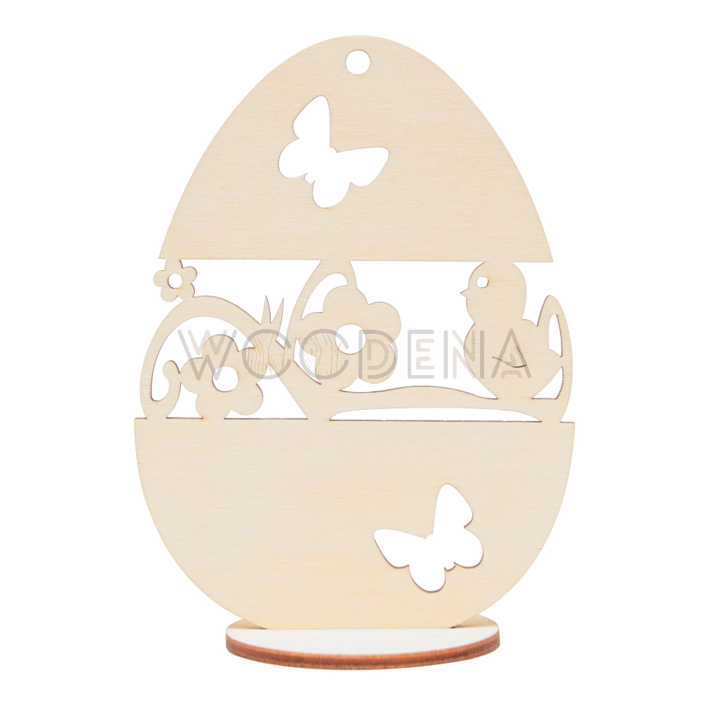 Drewniane jajko wielkanocne z wyciętą grafiką obrazującą kurczaczka wielkanocnego, motylki i kwiatki posiada podstawkę. W związku z tym jajko na podstawce można umieścić w każdym miejscu np. na wielkanocnym stole, w koszyczku, czy na biurku. Drewniana ozdoba wielkanocna jajko z motylkami na podstawce posiada nawiercony otwór, więc doskonale sprawdzi się w formie zawieszki na okno. Jajko wielkanocne zawieszka można powiesić na drewnianym drzewku ze sklejki lub na ścianie. Drzewko wielkanocne z ozdobami cieszy się coraz większą popularnością.