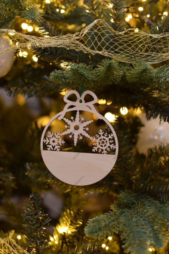 Ozdobę świąteczną, wraz z innymi bombkami ze sklejki, polecamy poddać opalaniu. W takiej formie bombka ze śnieżynkami doskonale komponuje się na żywym drzewku.