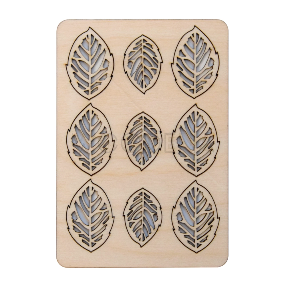 Zestaw składa się z 9 liści drewnianych w dwóch wymiarach. Mniejszy liść ma wymiar 23x35 mm, a większy liść 28x43 mm.